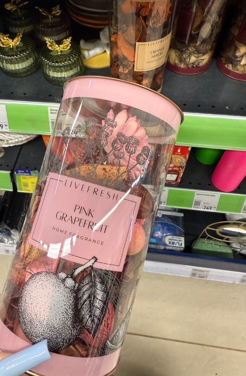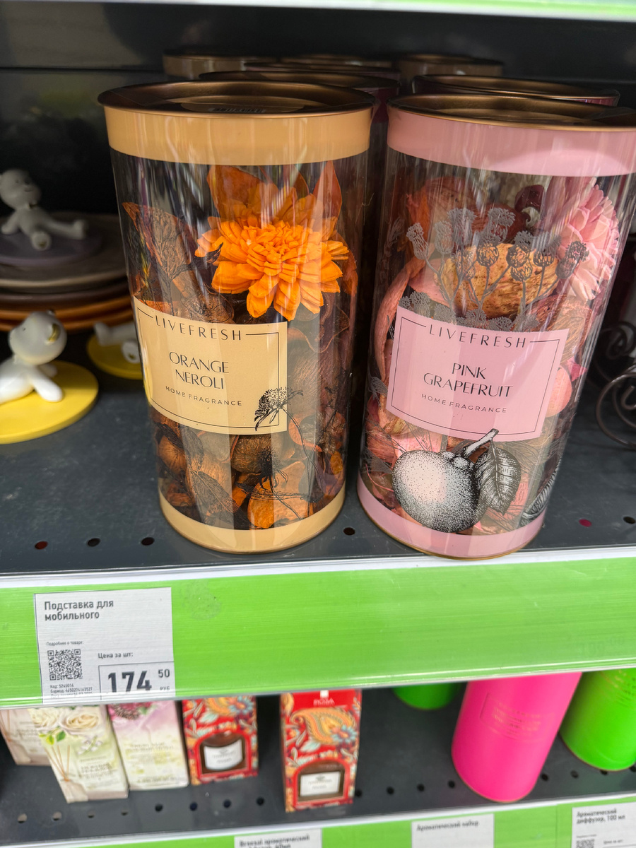Больше всего меня привлекли сухоцветы в упаковке. Я знаю, что их используют для украшения ваз и для фотосессий. Было несколько вариаций, и некоторые из них ещё и ароматизированные.