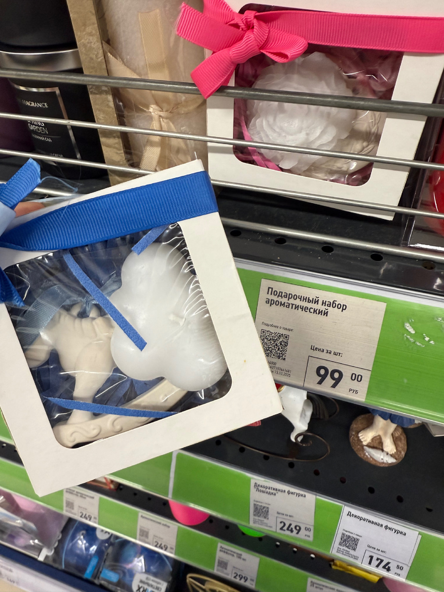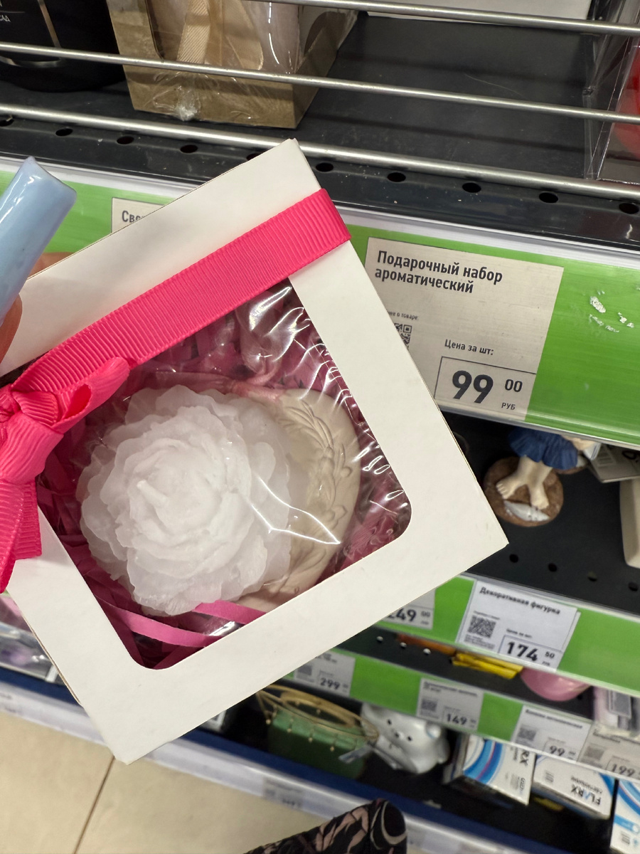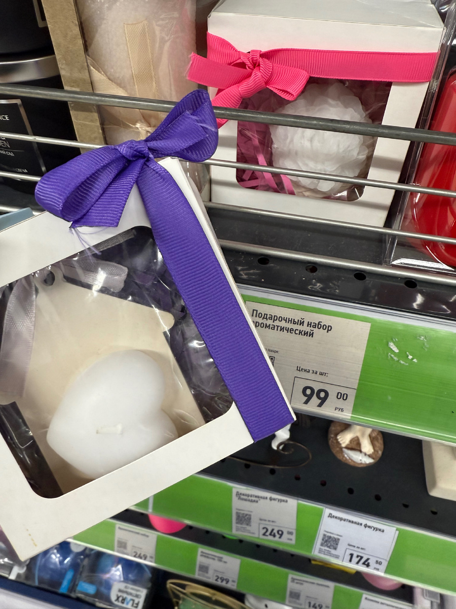 Обнаружила формовые свечи, которые не стыдно подарить просто как знак внимания. Было сердечко с домиком в подарочной упаковке и цветок. На детскую тематику нашёлся забавный набор.