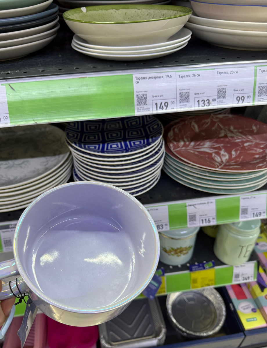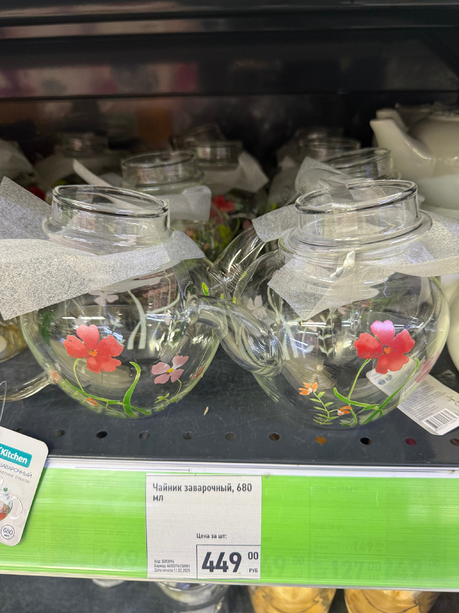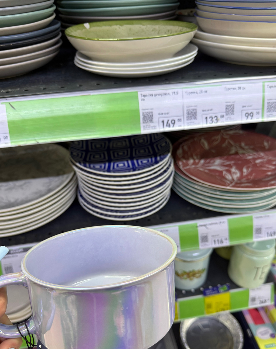 Из посуды привлекли симпатичные минималистичные банки. Чашечки плоские с перламутровым отливом — в них удобно есть кашу или суп. А вот весенняя чашка с цветами (предполагаю, сакура?) не заслуживает внимания. Во-первых, раньше были симпатичнее. Во-вторых, мне попалась бракованная. Если бы она была нормальной, я бы оценила её преимущества, но сомневаюсь, что она выдерживает высокие температуры. Я наливала туда горячую воду, и чашка лопнула. Также были очень весенние чайники, но с несовременным дизайном. К сожалению, они мне не понравились, и цена завышена.