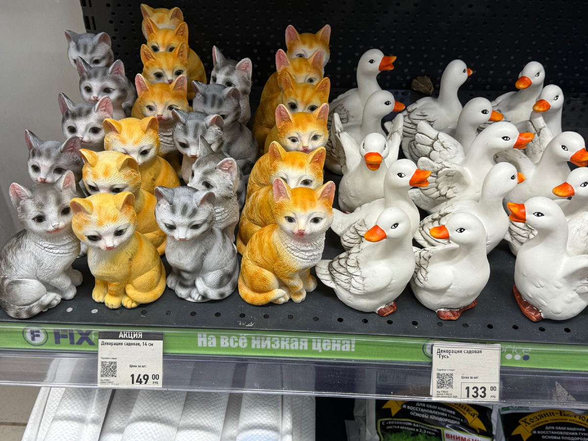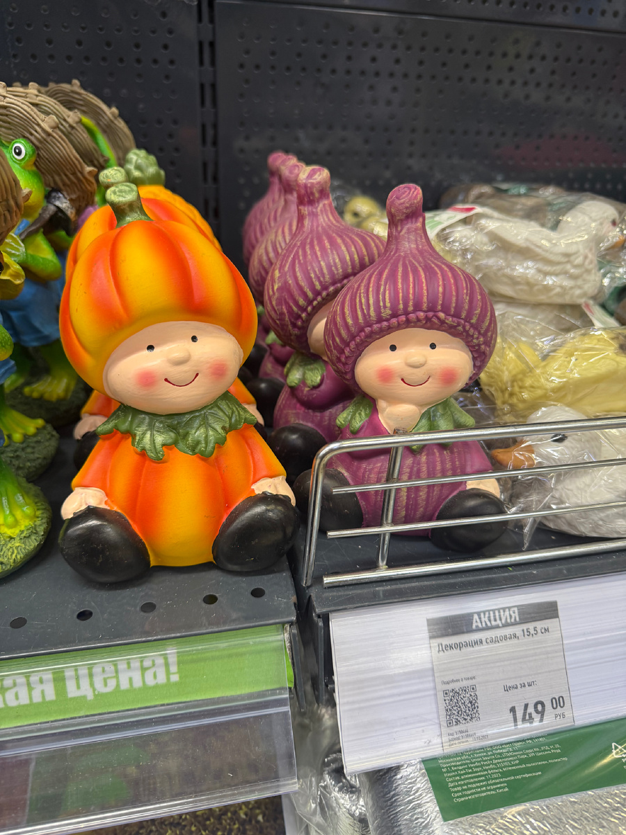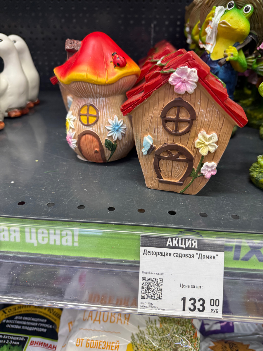 Было много декора для сада. Скоро дачный сезон, так что подобные вещи будут весьма кстати. При покупке стоит внимательно проверять отсутствие сколов. Цена очень приятная для садовых аксессуаров. Мне особенно запомнились домик и лягушки.