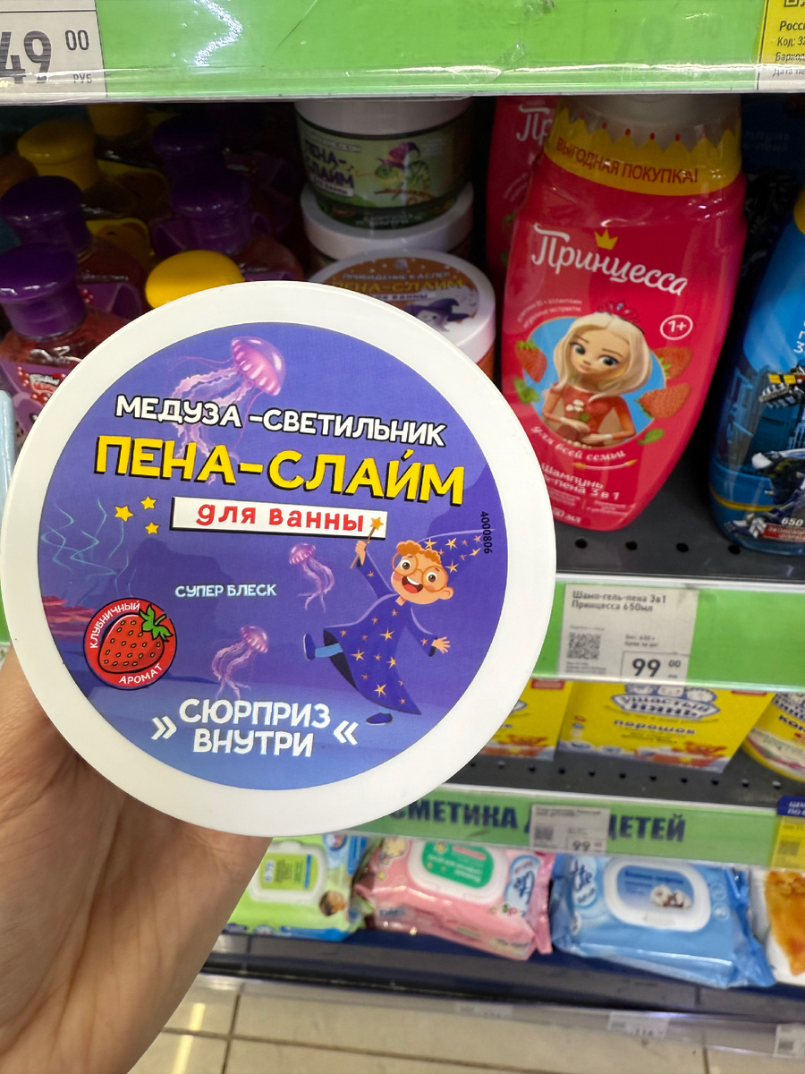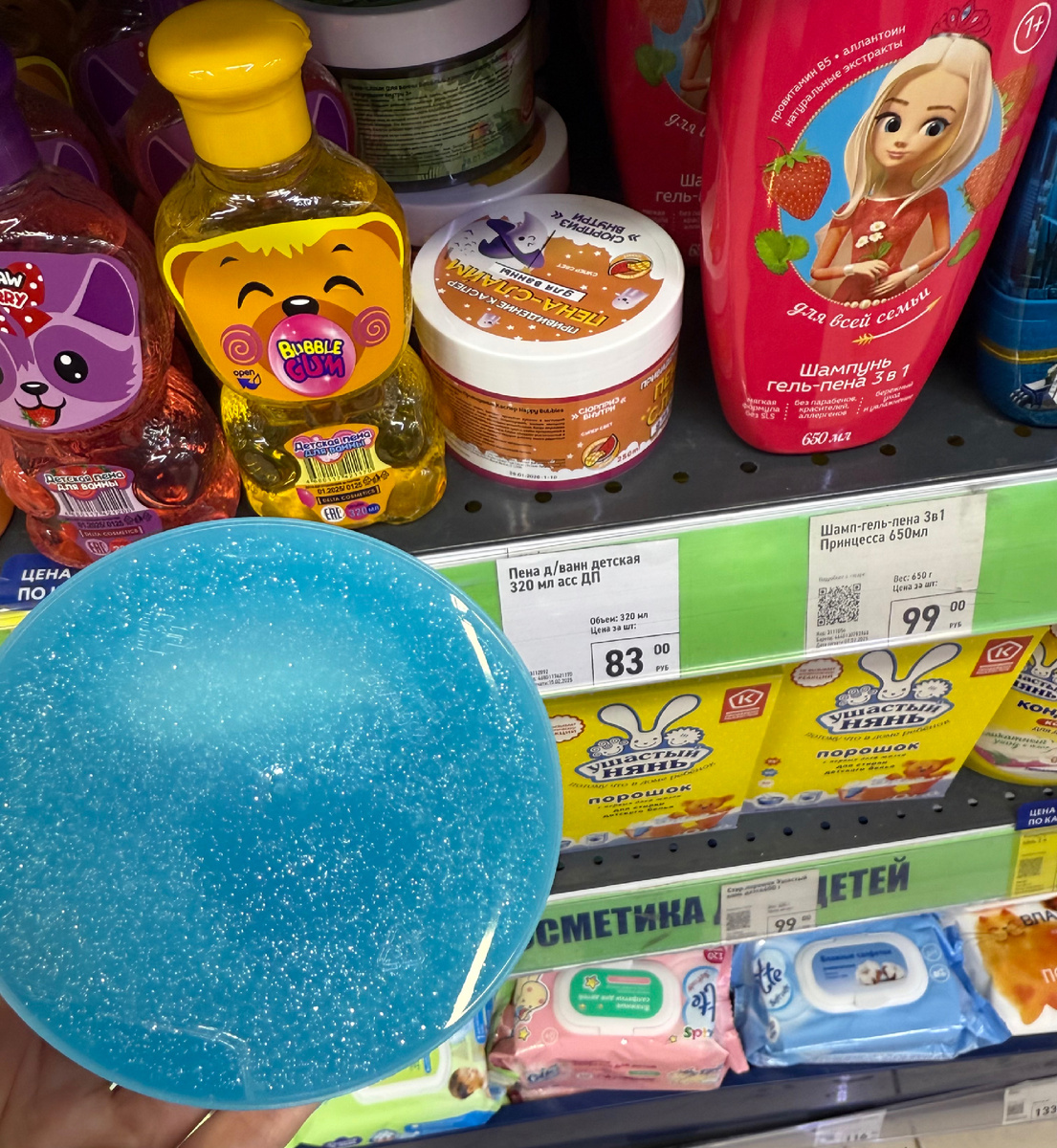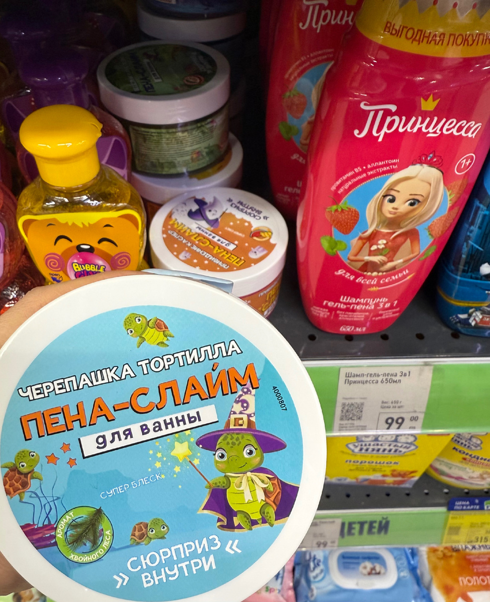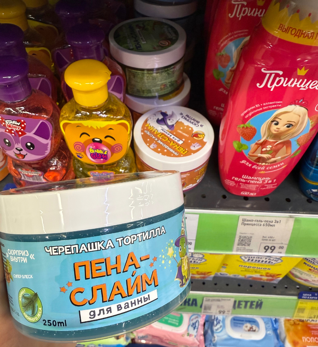 В косметическом отделе я нашла забавные детские штучки. Например, пену для ванны Mama Mila в форме животных, каждый со своим запахом. Также внимание привлекла пенка для ванны в банке. Я покрутила несколько вариантов и больше всего мне понравилась та, что с блестками. Купила бы её только ради них, но у меня была маленькая сумка, поэтому я отложила покупку до посещения магазина рядом с домом.