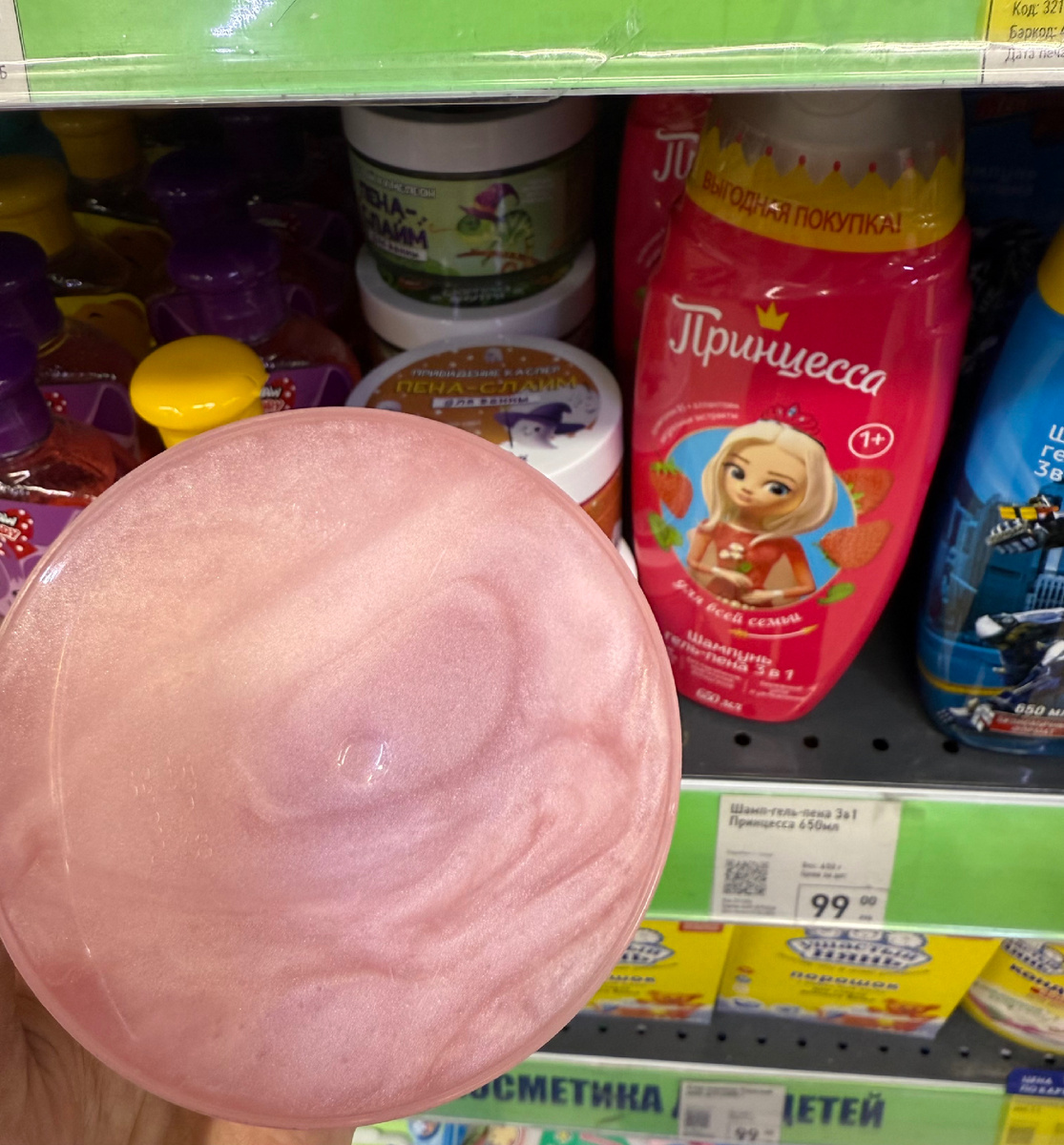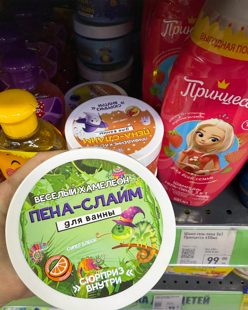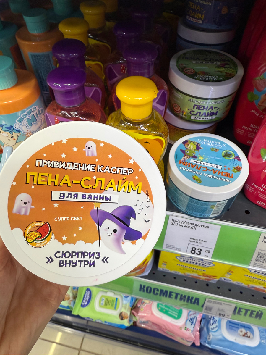 В косметическом отделе я нашла забавные детские штучки. Например, пену для ванны Mama Mila в форме животных, каждый со своим запахом. Также внимание привлекла пенка для ванны в банке. Я покрутила несколько вариантов и больше всего мне понравилась та, что с блестками. Купила бы её только ради них, но у меня была маленькая сумка, поэтому я отложила покупку до посещения магазина рядом с домом.