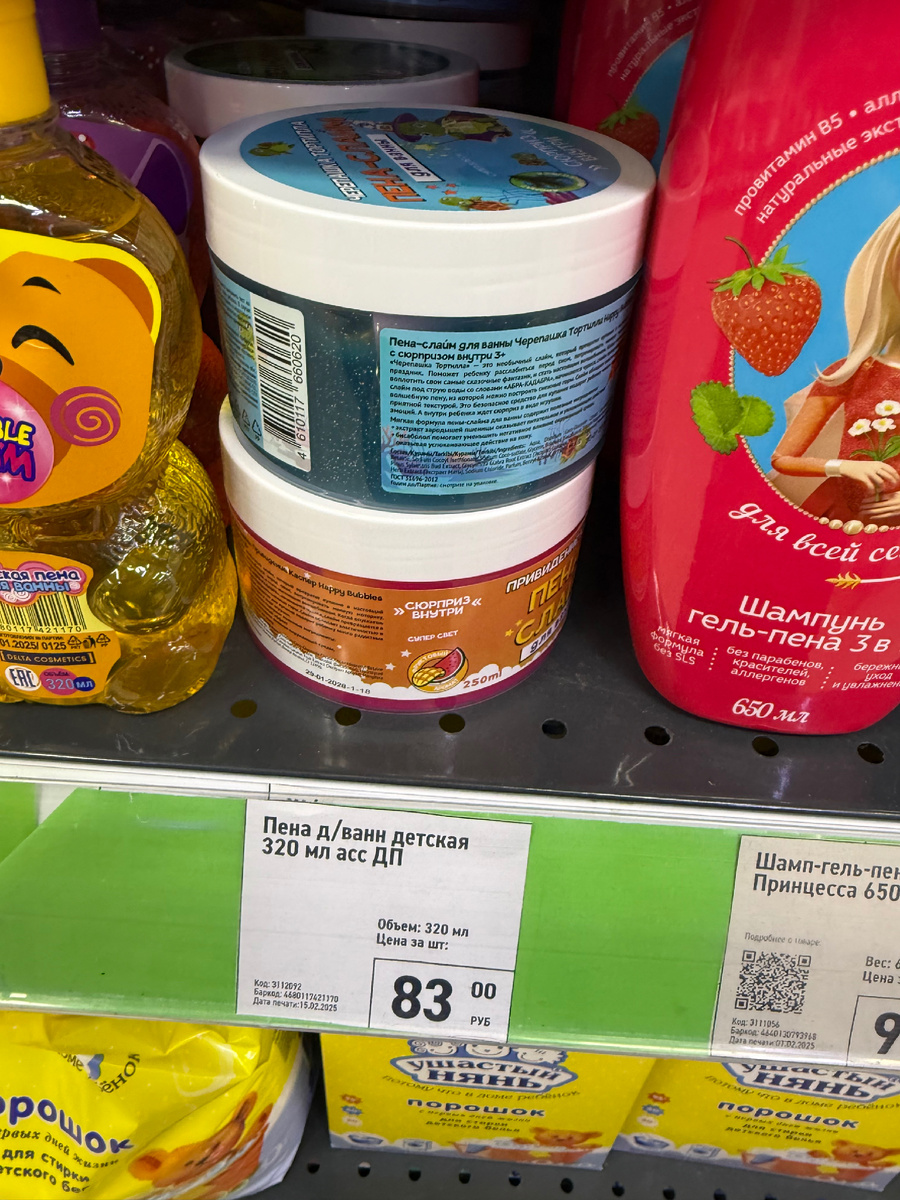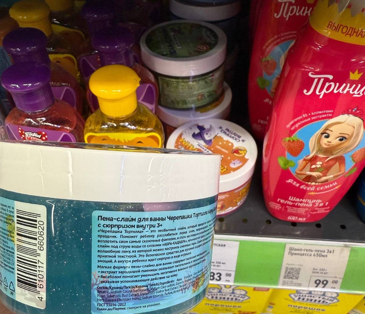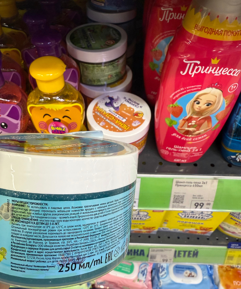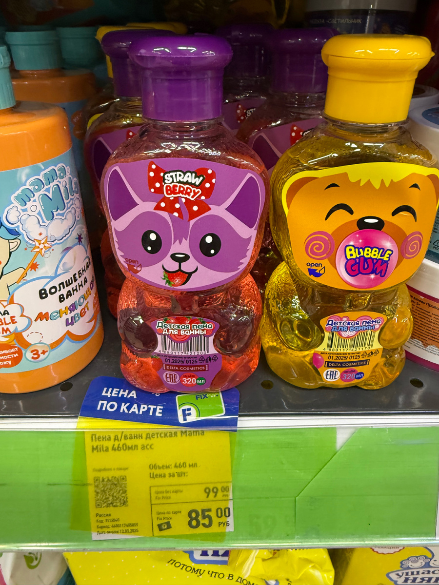 В косметическом отделе я нашла забавные детские штучки. Например, пену для ванны Mama Mila в форме животных, каждый со своим запахом. Также внимание привлекла пенка для ванны в банке. Я покрутила несколько вариантов и больше всего мне понравилась та, что с блестками. Купила бы её только ради них, но у меня была маленькая сумка, поэтому я отложила покупку до посещения магазина рядом с домом.