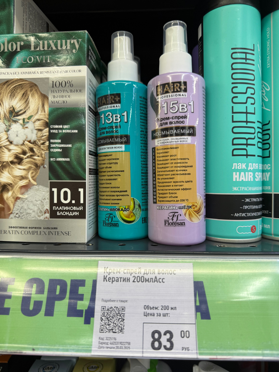 От компании Floresan нашла крем-спрей для волос: один с кератином и авокадо, другой — кератин и шёлк. Думаю, это будет популярное средство. Марка Floresan хорошо известна и продаётся в других местах, но дороже.