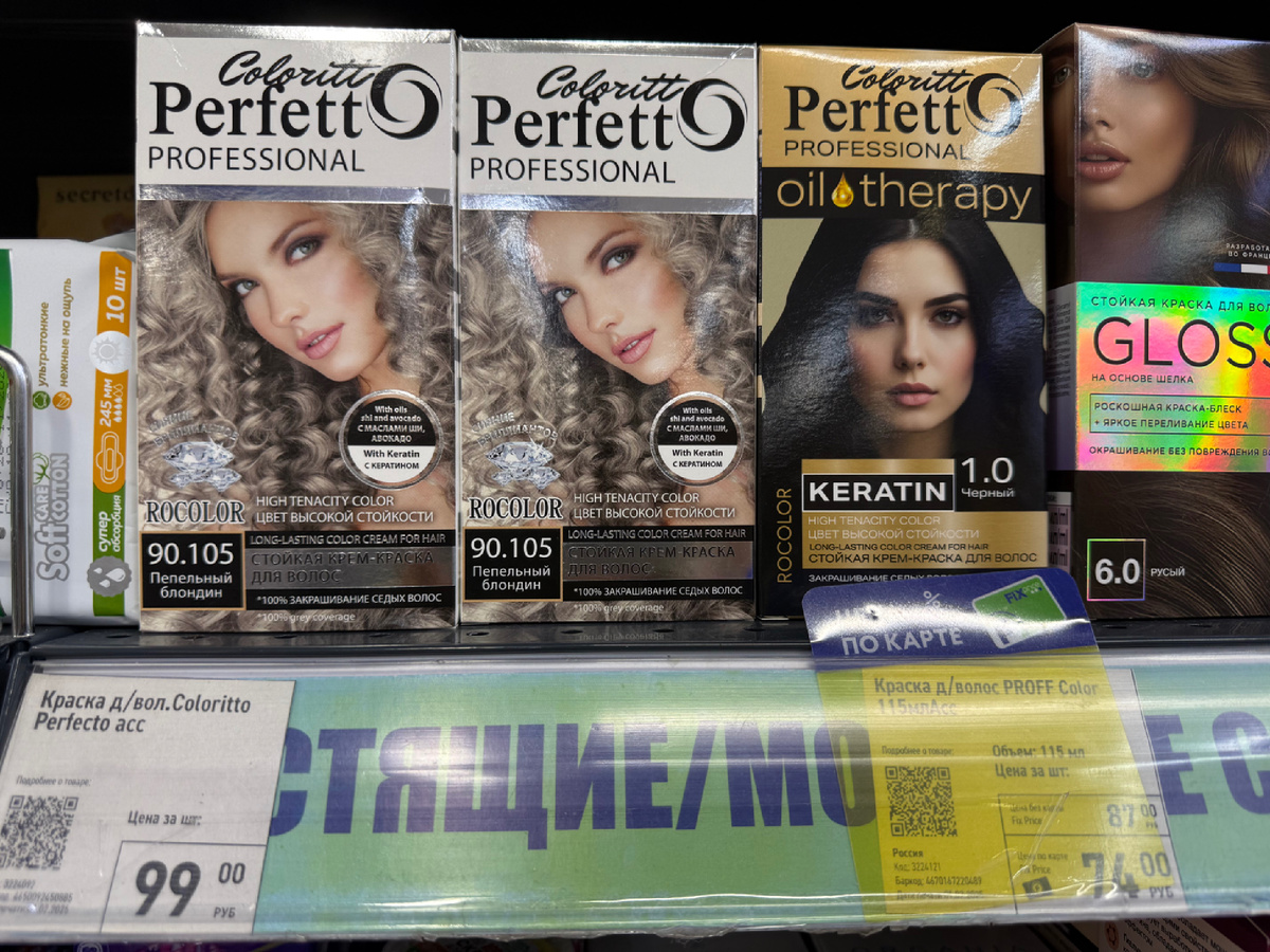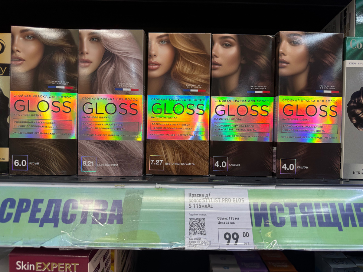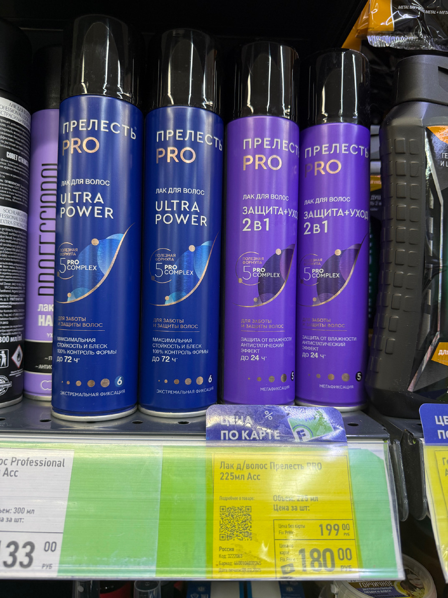 От фирмы «Прелесть» было много лаков для волос высокой степени фиксации. Цена на них адекватная. Также обнаружила стойкие краски для волос Stylist Pro Glos в разных оттенках, включая интересный «пыльная роза». Раньше таких не видела.