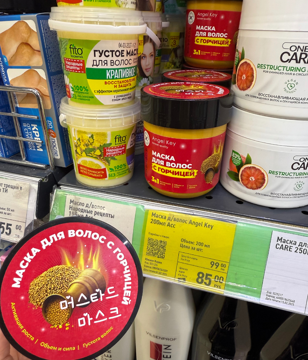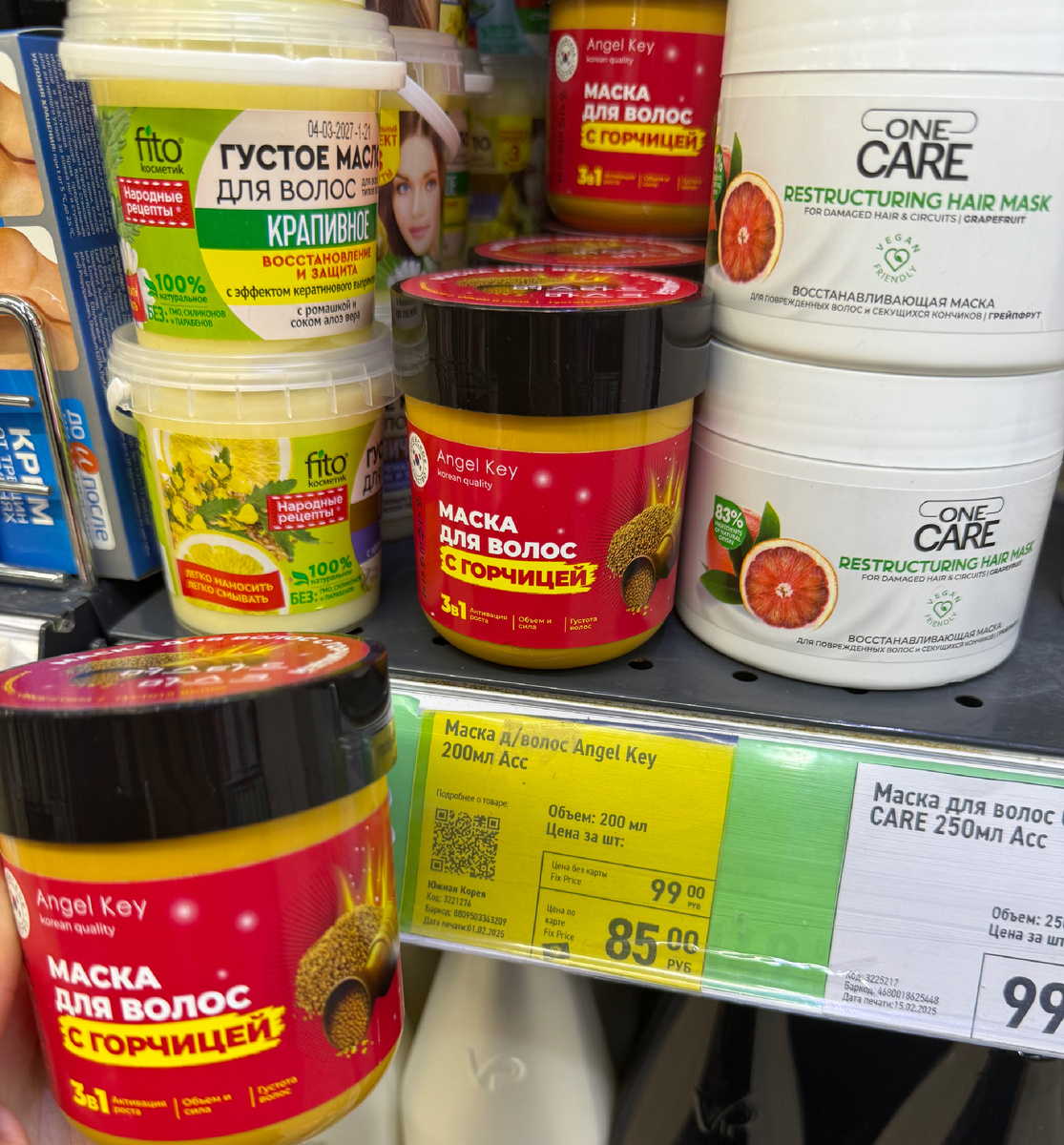Увидела много новых шампуней: Schauma, Shantu (надеюсь, правильно запомнила название). Знаю, что многие пользуются такими марками и они им подходят. Цена в Fix Price определённо хорошая. Заинтересовала маска для волос с горчицей от Angel Key. Думаю, она будет разогревать кожу головы и стимулировать рост волос. Однако меня смутило, что патчи этой же фирмы мне не подошли.