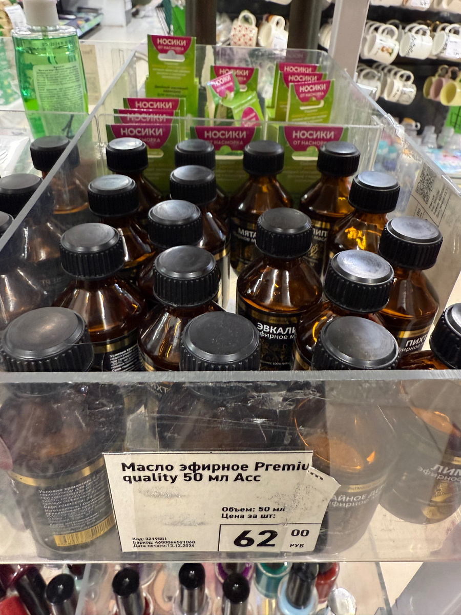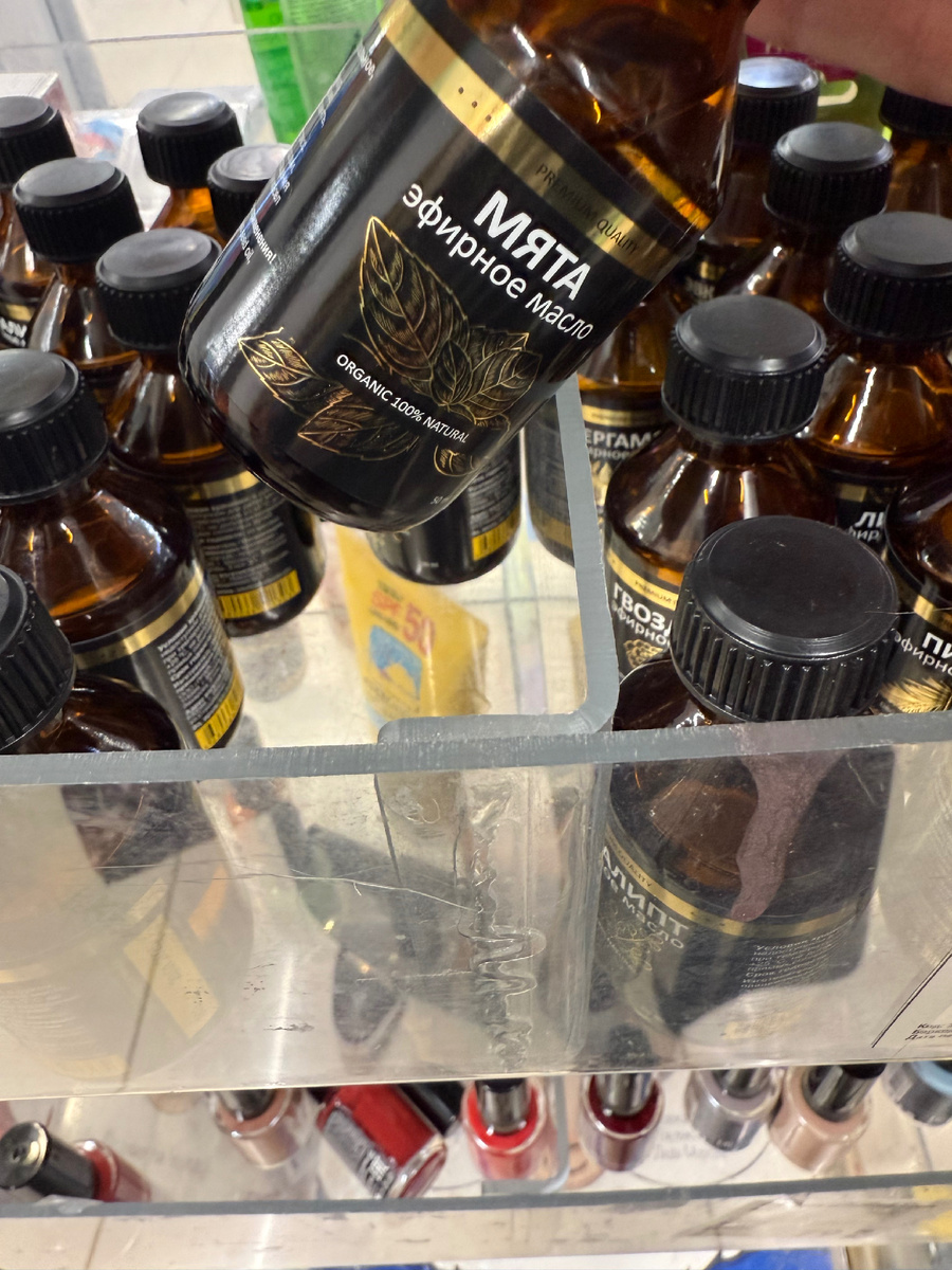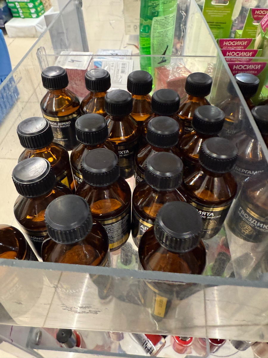 В прикассовой зоне обнаружила большой ассортимент эфирных масел: гвоздика, мята, пачули, лимон, апельсин, можжевельник. Стоимость 62 рубля — неплохо, хотя в аптеке может быть не дешевле. Их можно добавлять в уходовую косметику или использовать в аромалампе.