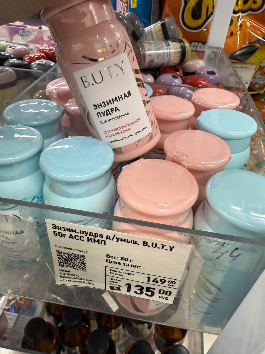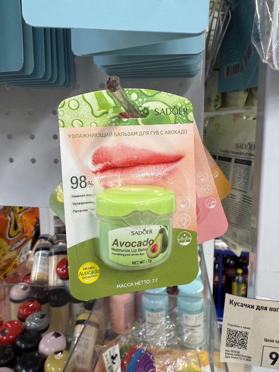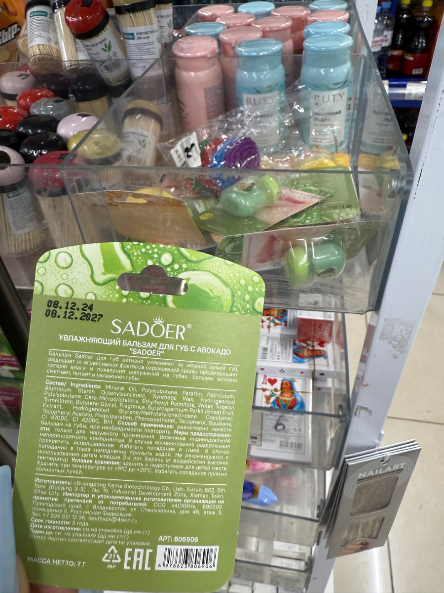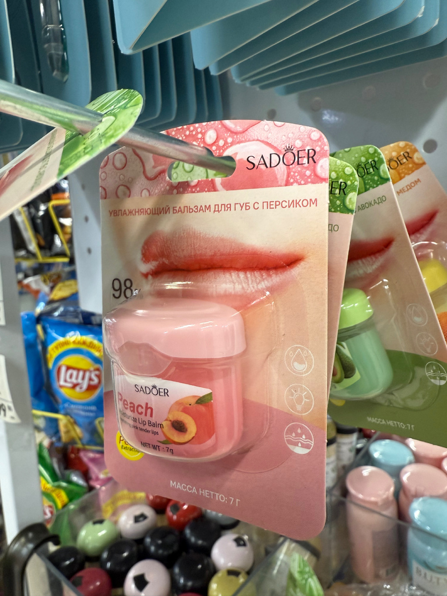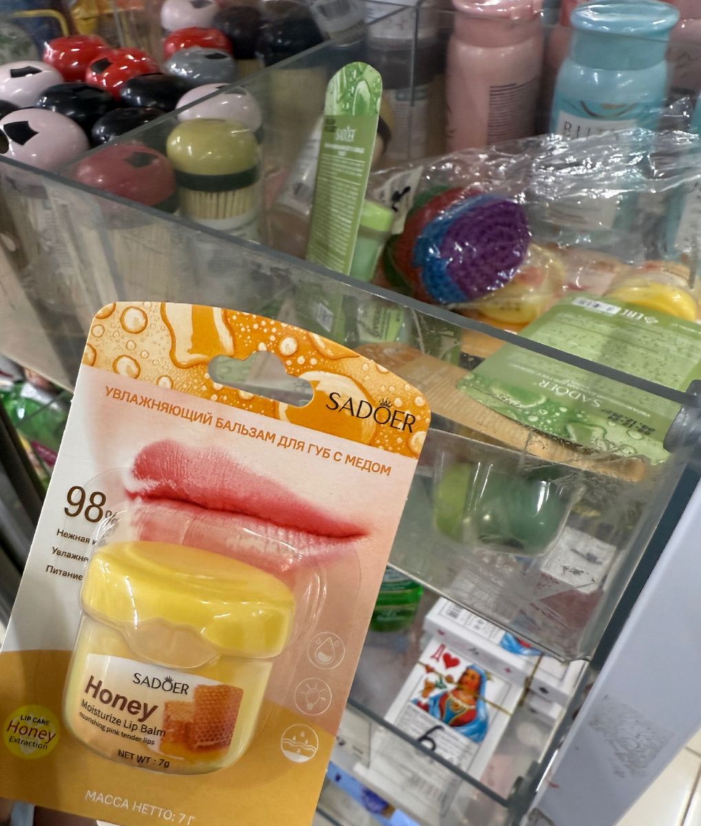 Затем я нашла большой выбор бальзамов для губ с разными составами, ароматами и форматами. Увлажняющий бальзам Sadoer с мёдом, персиком, авокадо (производство Китай). Подозреваю, есть и цветные, но в нашем магазине их не было. Экзимная пудра — отличная вещь для обновления кожи, тоже китайского производства. Было несколько видов.