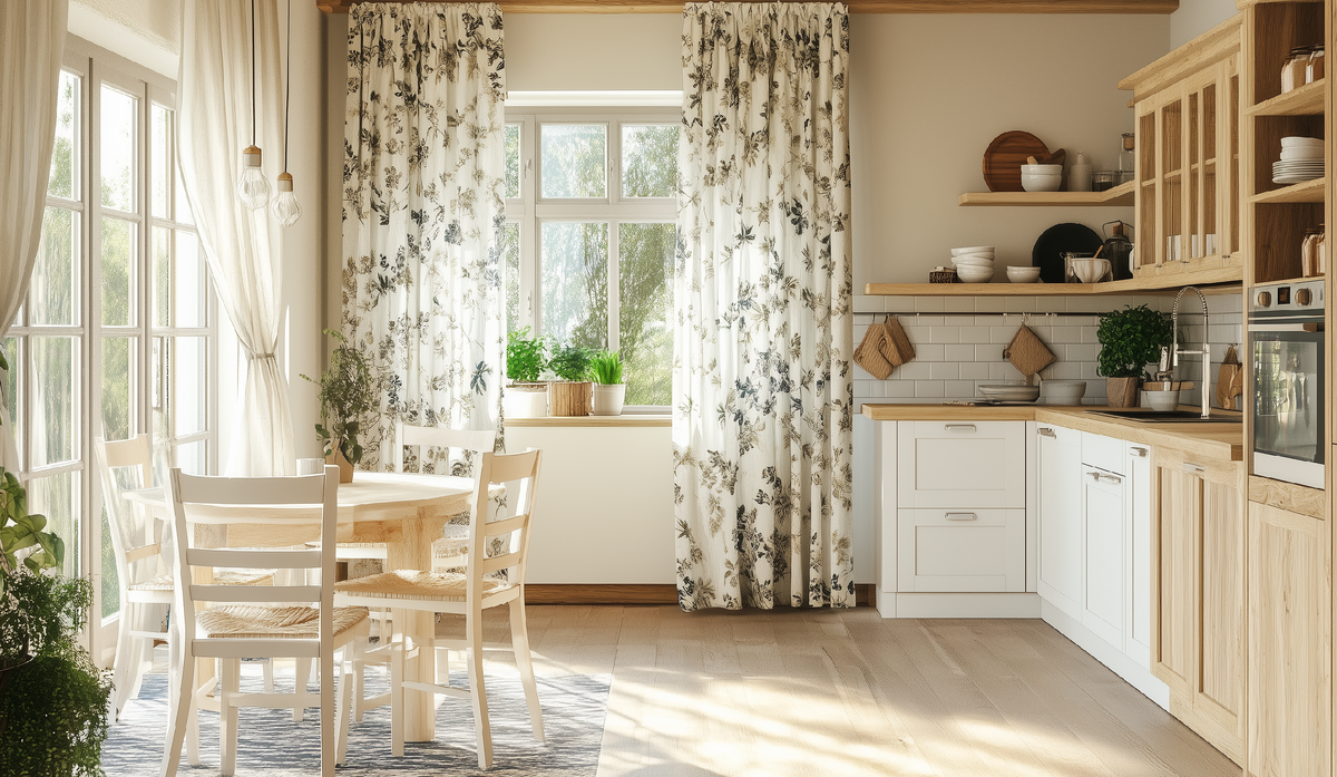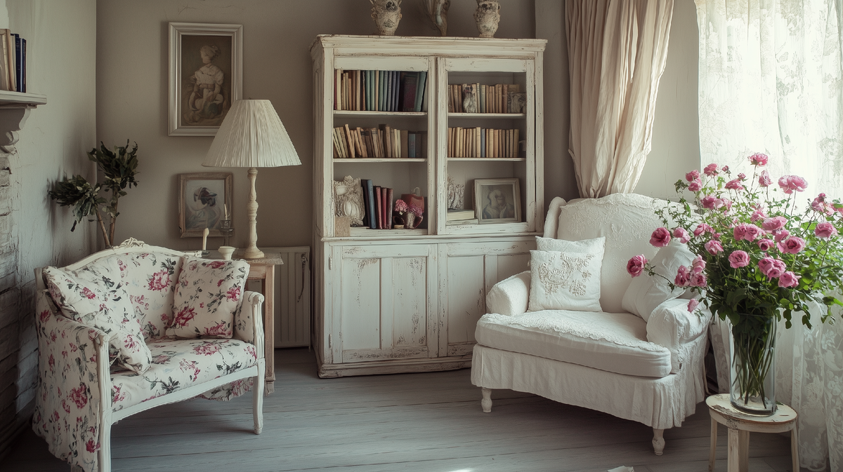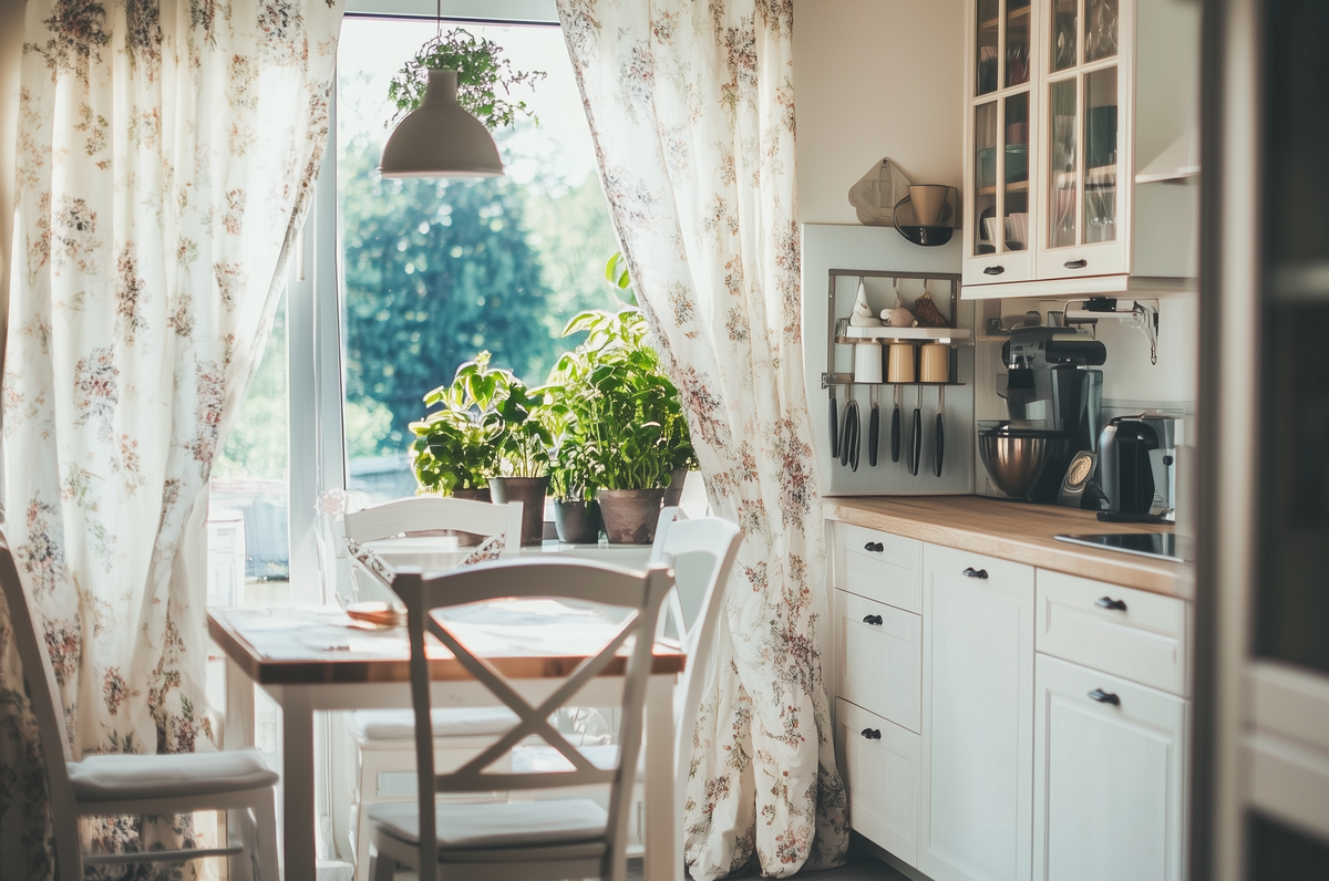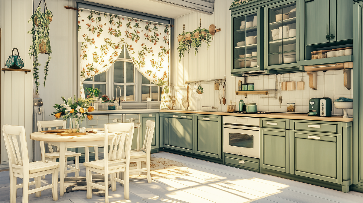 Кухня: Здесь стиль раскрывается наиболее полно. Актуальны фасады кухонного гарнитура в белых, кремовых или пастельных тонах, открытые полки с красивой керамической посудой, фартук из плитки с цветочным орнаментом. Обеденный стол украшают льняными скатертями, а пространство — плетеными корзинами и горшечными растениями.