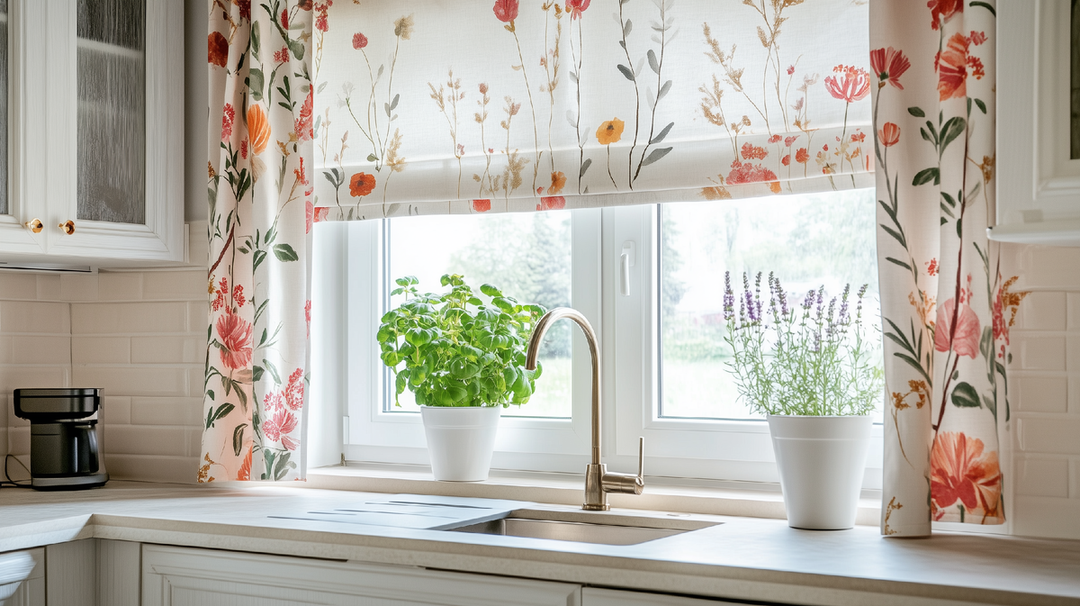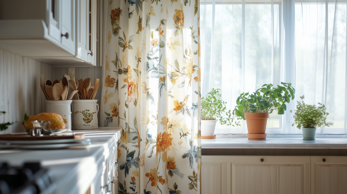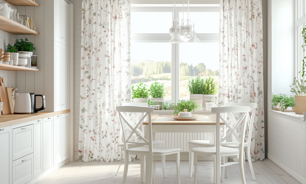 Легкие шторы с цветочным орнаментом — типичный элемент провансальского окна.
