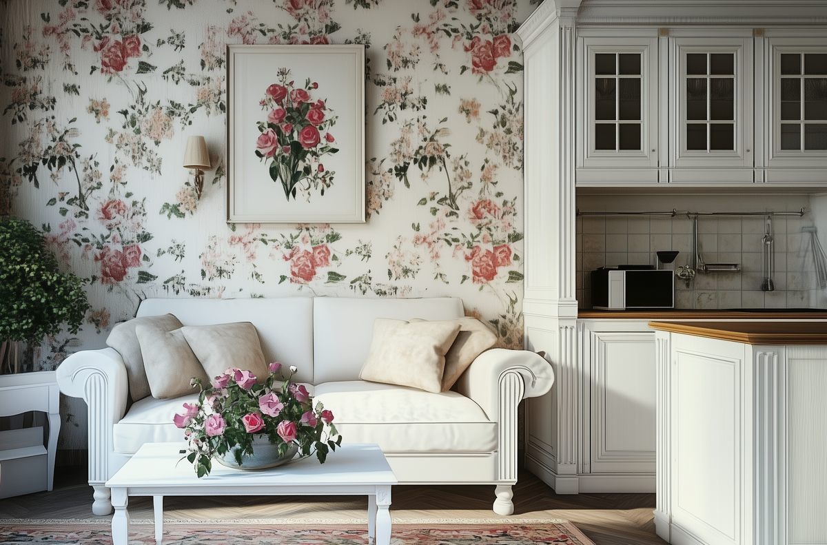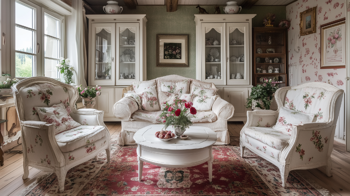 Гостиная: Центром композиции часто становится мягкая мебель, обитая тканями с цветочным принтом. Дополняют интерьер деревянный журнальный столик, ковер с неброским узором, картины с пейзажами и открытые полки с книгами и декором.