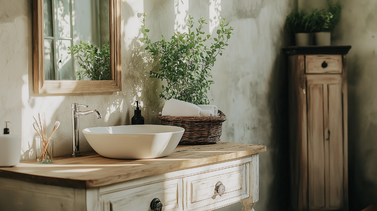 Ванная комната: Для отделки используется плитка под камень или с мелким орнаментом. Уместны деревянные тумбы, раковина на ножках, зеркало в широкой раме, плетеные корзины для белья и текстиль в пастельных тонах.