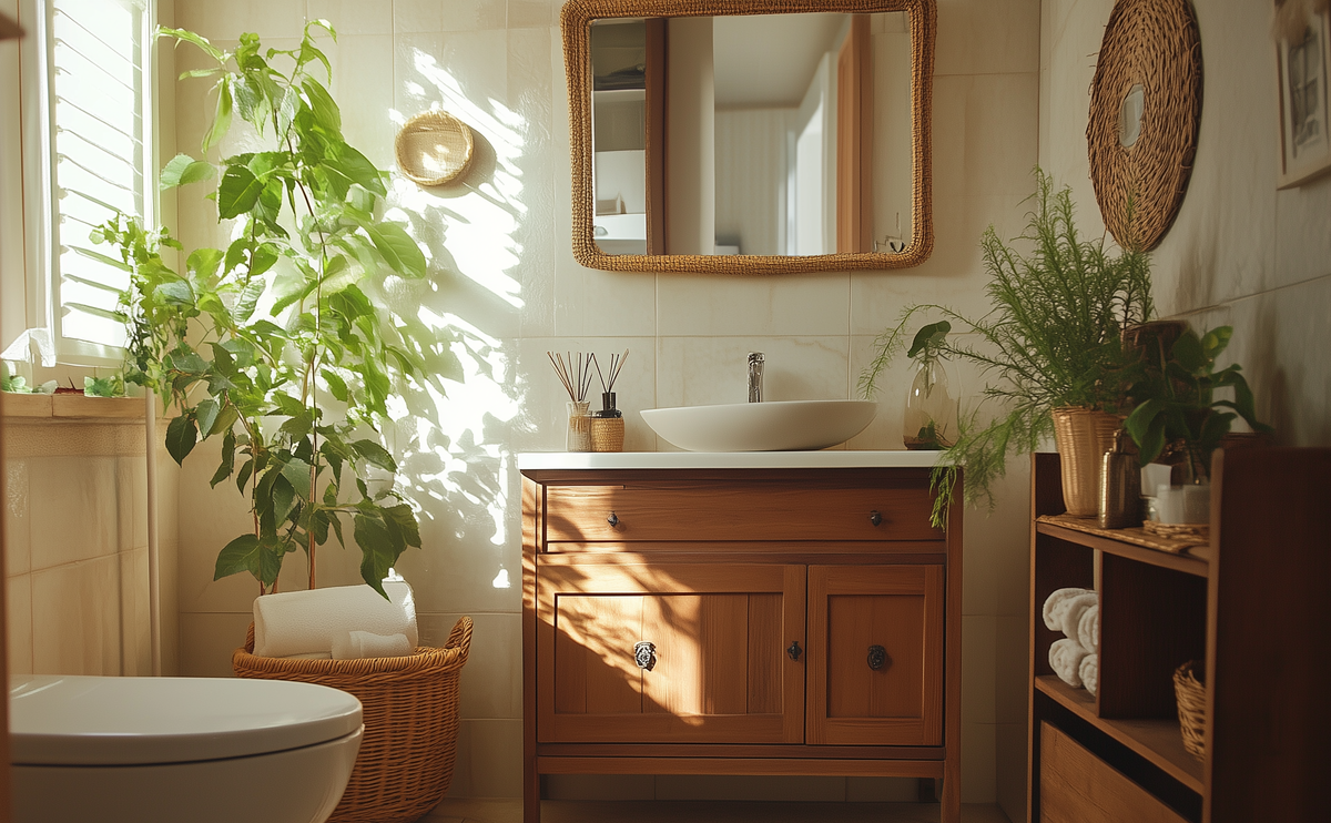 Ванная комната, оформленная с использованием дерева и натурального текстиля.