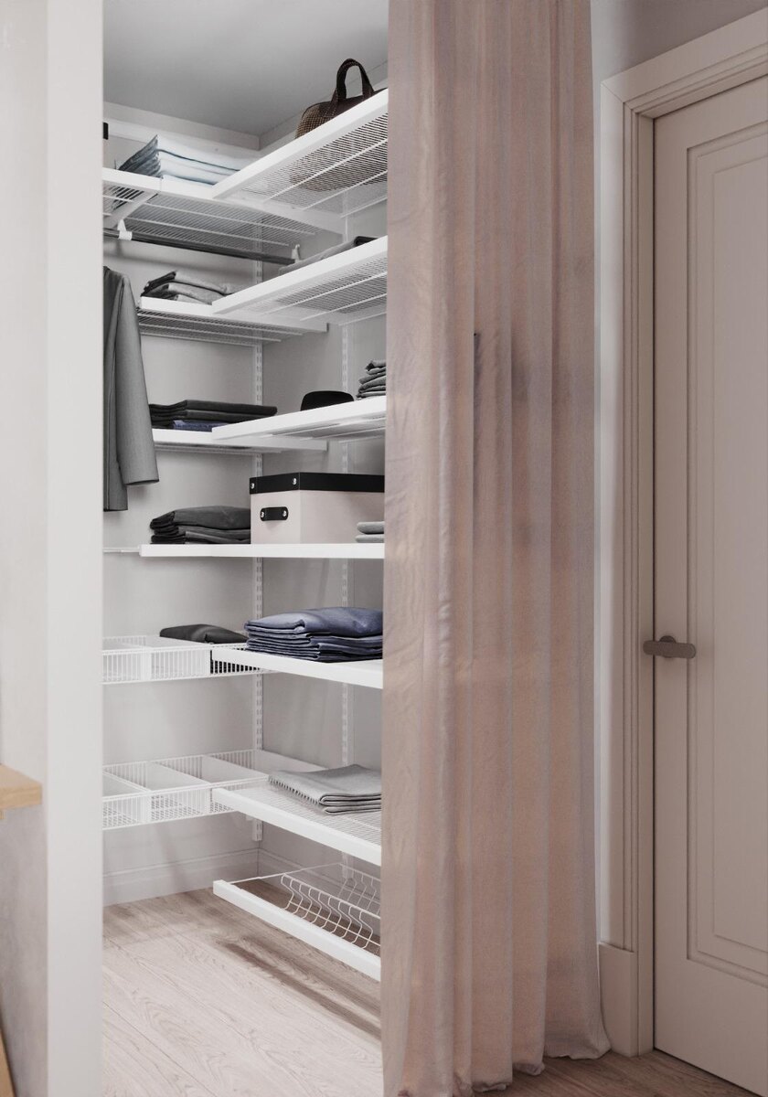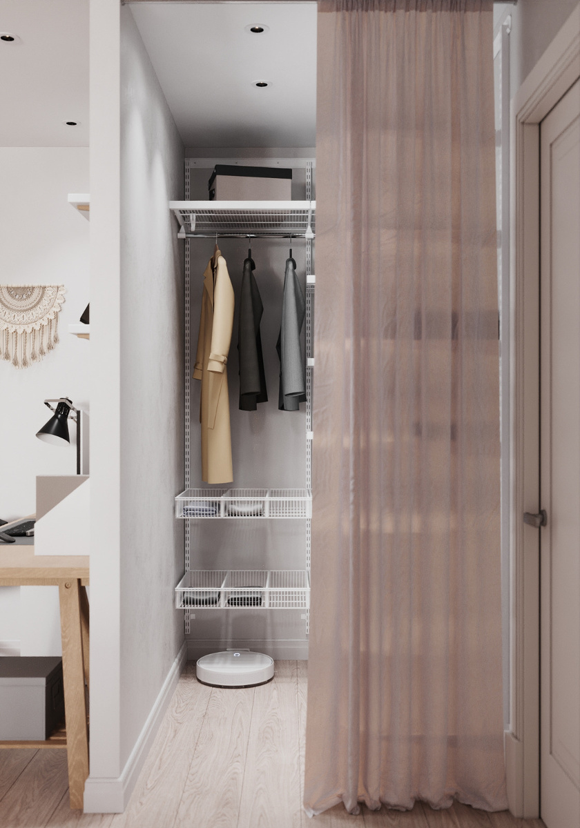 Вход в просторную гардеробную оформлен не дверью, а текстильной шторой. Это решение не только соответствует общей стилистике, но и облегчает навигацию для робота-пылесоса, база которого расположена внутри этого помещения.