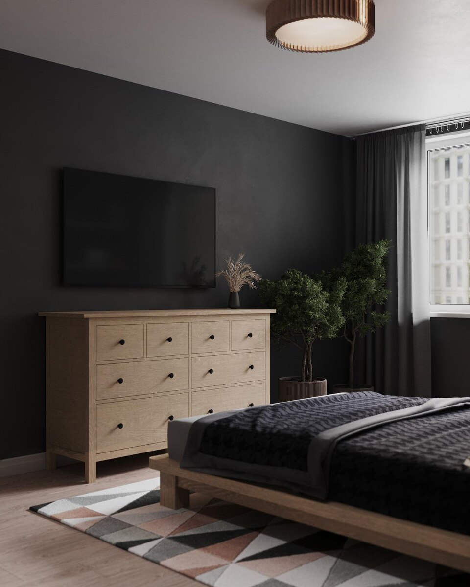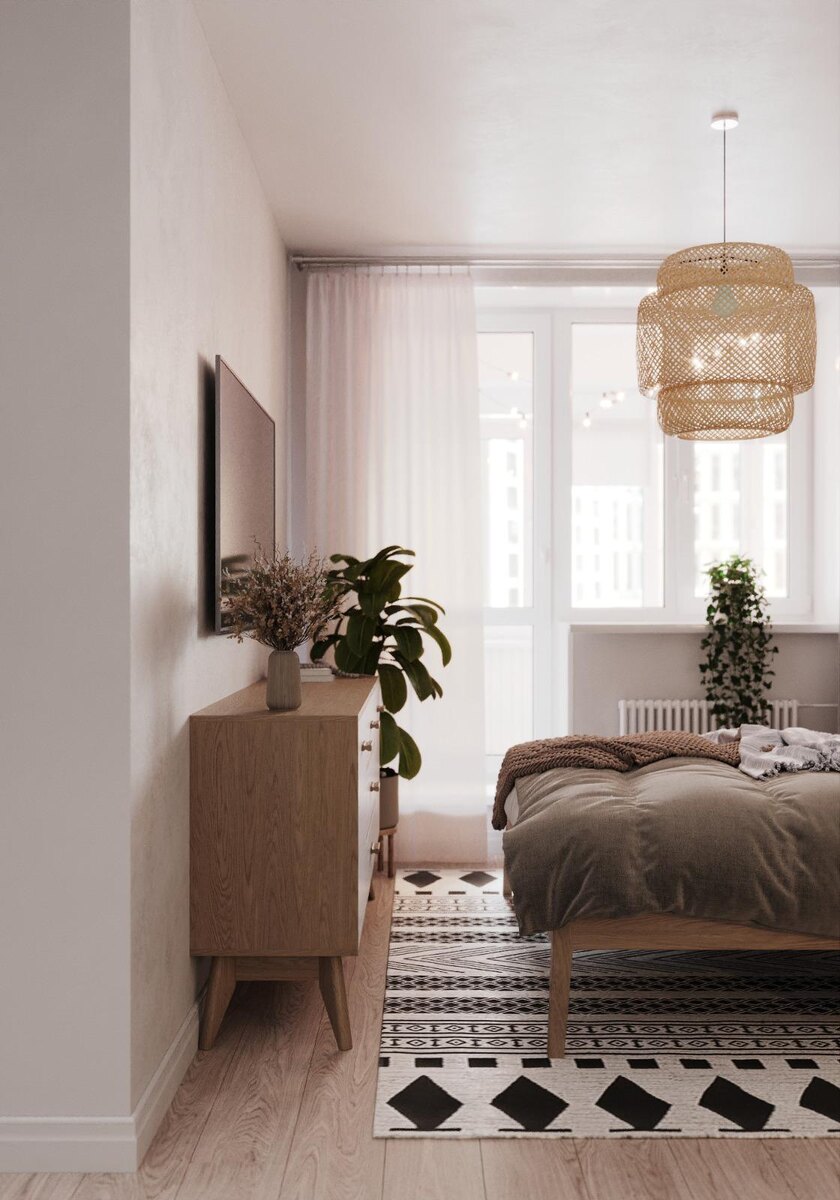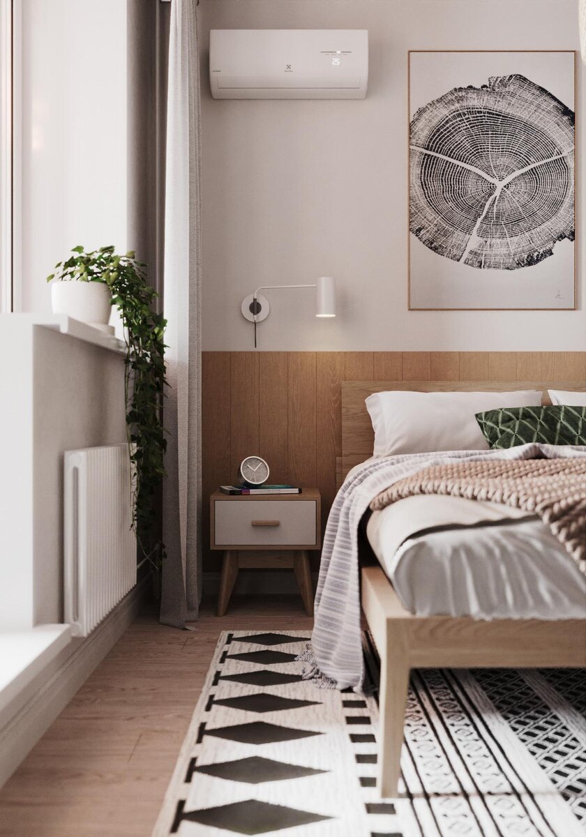 Интерьер спальни построен на сочетании функциональности и эстетики. На полу размещён ковёр с традиционным скандинавским орнаментом. Мебель изготовлена из массива дерева и отличается лаконичными, простыми формами. Декор использован сдержанно: в изголовье кровати — черно-белый принт с изображением среза дерева в тонкой раме, а у окна — несколько кашпо с живыми растениями, которые добавляют пространству свежести и цвета.