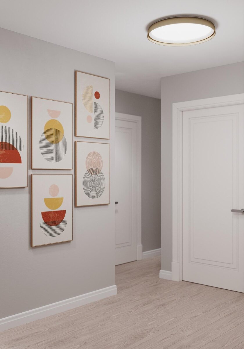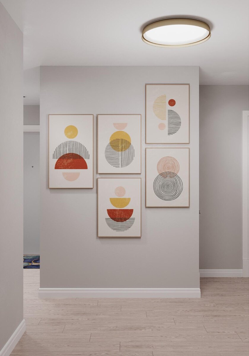 Холл — просторная зона, оставленная практически пустой. Её украшает тематический коллаж из пяти графических работ в едином стиле, что является типичным приёмом скандинавского дизайна. Интересно, что форма потолочного светильника перекликается с круговыми мотивами на этих рисунках.