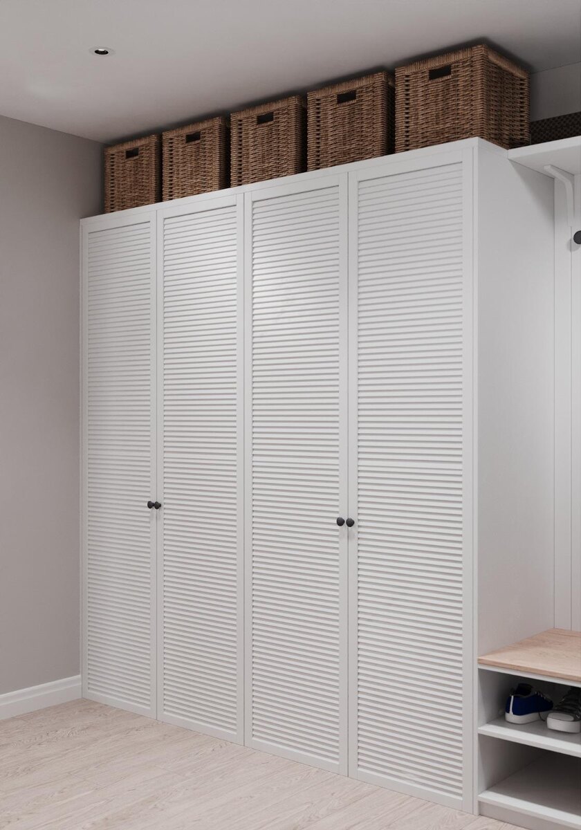 Прихожая и холл занимают площадь более 13 квадратных метров. Прихожая представляет собой вытянутое помещение без естественного освещения, поэтому для его визуального расширения использованы светлые оттенки в отделке стен и мебели. Фасады шкафов выполнены из МДФ с жалюзийными рейками и покрыты эмалью — этот материал обеспечивает стабильность геометрии, в отличие от массива дерева.