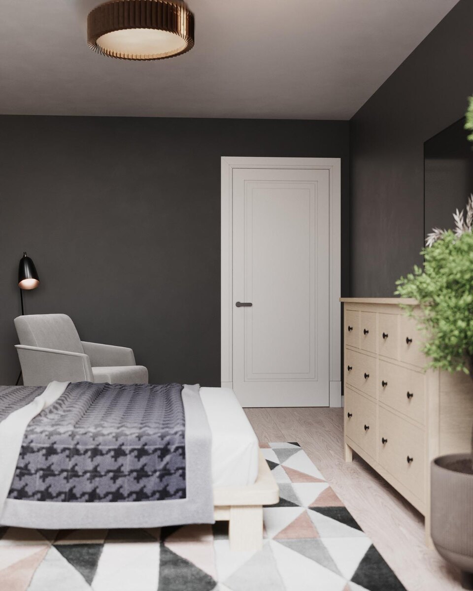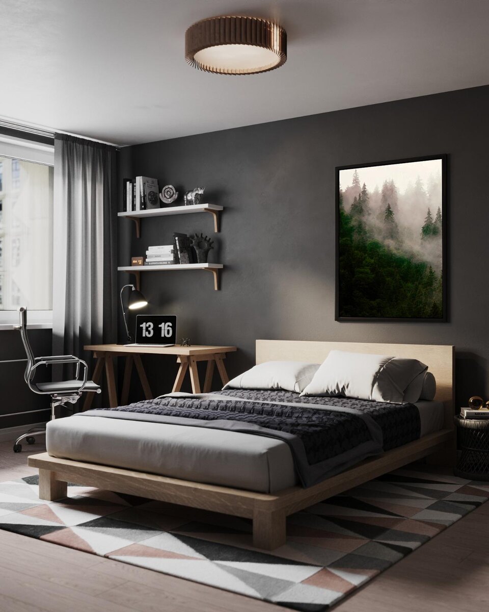 Спальня для подростка, в отличие от остальных помещений, выполнена в более тёмной и контрастной гамме, что соответствует пожеланиям молодого хозяина. Стены окрашены в глубокий цвет тёмного графита полуматовой краской. Мебель из массива дерева обработана масло-воском, а на полу лежит ковёр со средним ворсом и выразительным геометрическим принтом.