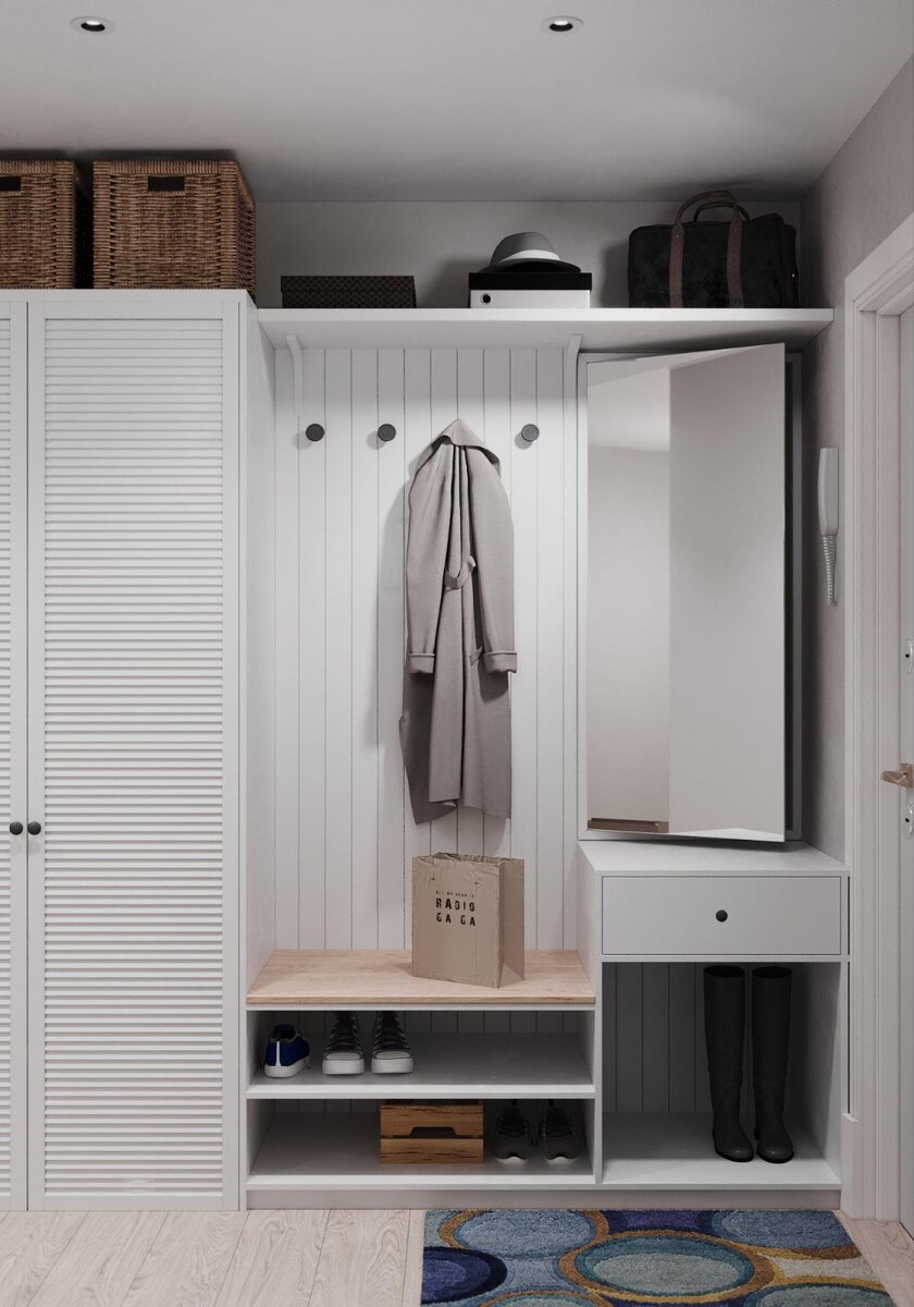 Уют в прихожей создают детали: плетёные корзины на шкафу, декоративные дощечки в белой эмали, обрамляющие открытую вешалку, и яркий дверной коврик. Зеркало закреплено на фасаде компактного шкафчика, внутри которого скрыты коммуникации: электросчётчик, роутер и крючки для ключей.