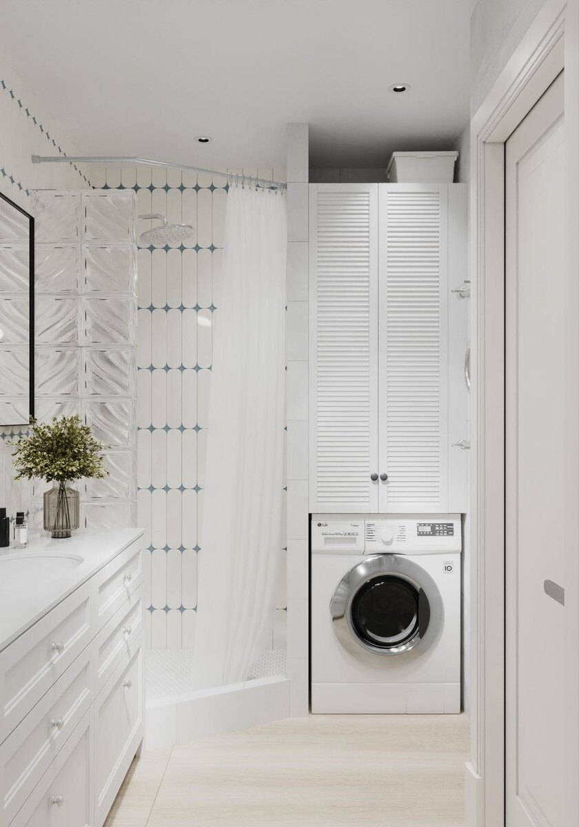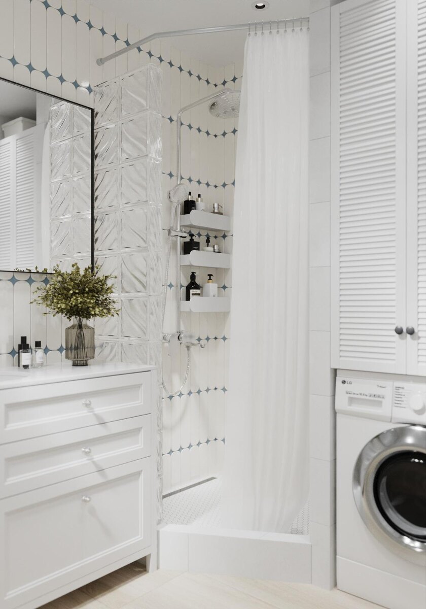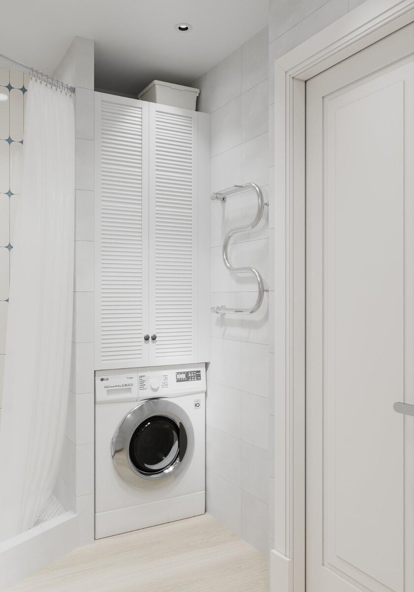Санузел в квартире раздельный. Площадь ванной комнаты составляет почти 4 квадратных метра, что позволило реализовать практичные решения. Ванну заменили душевой кабиной с высоким бортиком, освободив место для встраивания стиральной машины и шкафа над ней.