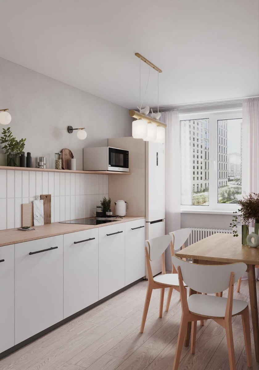 Вся мебель, светильники и декор на кухне выдержаны в скандинавской эстетике: минимум деталей, мягкие фактуры, преобладание светлых оттенков и натурального дерева. Подобный подход к преображению пространства демонстрирует, как творческое отношение к деталям может кардинально изменить восприятие объекта, что ярко иллюстрирует пример превращения бетонной колонны в элемент декора.