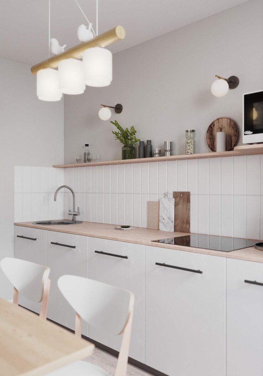 Кухня площадью 9 квадратных метров потребовала особых решений для визуального облегчения и увеличения простора. Для этого был демонтирован верхний дверной брус (притолока), что улучшило светопередачу из холла. Вместо стандартных навесных шкафов установлены открытые полки — характерный для сканди-стиля приём, который, несмотря на меньшую вместимость и необходимость частой уборки, делает пространство воздушнее и легче.