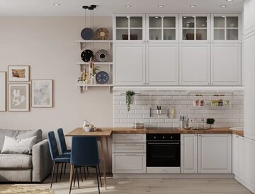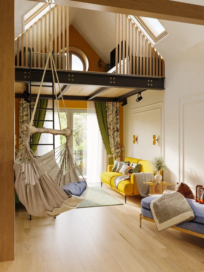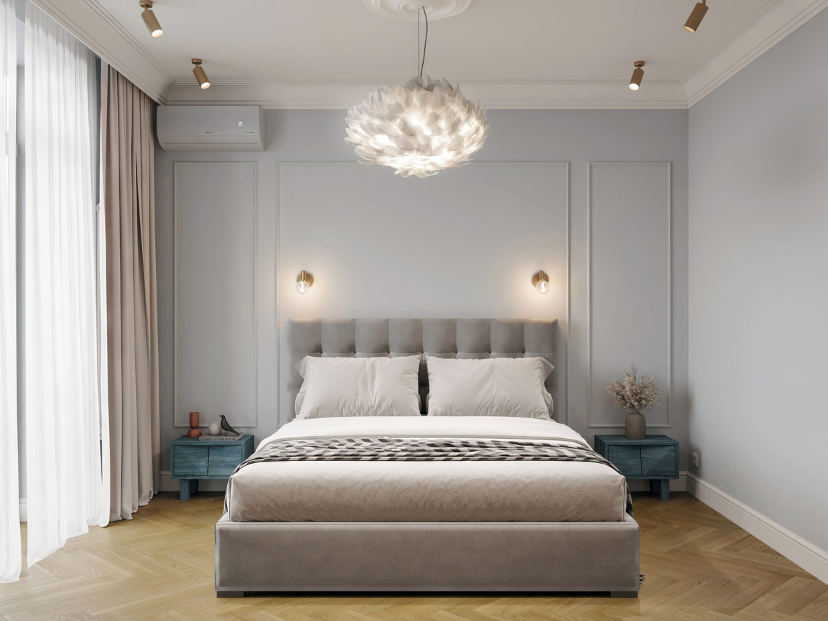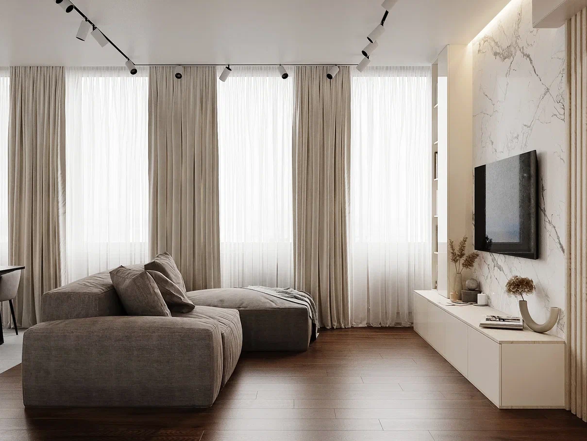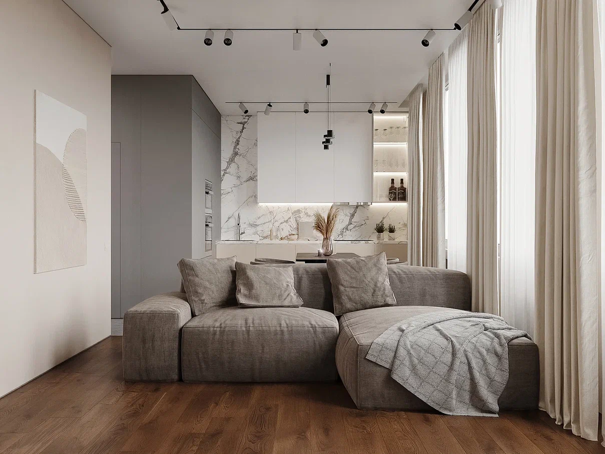- Воздушность: Обилие свободного пространства и света создаёт спокойную, не перегруженную атмосферу.