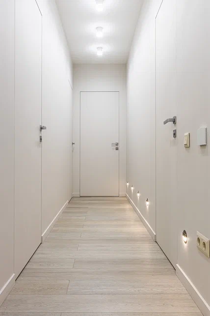 - Световая концепция: Белые стены и большие окна без тяжёлых занавесок максимизируют естественное освещение, создавая ощущение простора.