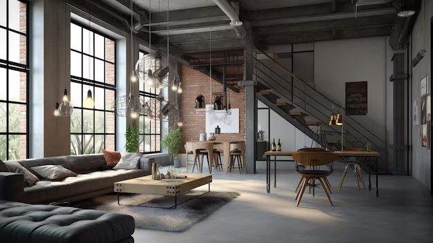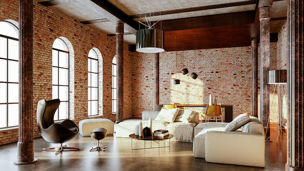 - Индустриальные материалы: Открытая кирпичная кладка, бетонные стены и потолки, металлические балки, трубы и осветительные системы.