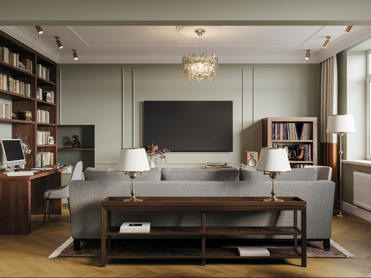 - Адаптированные классические элементы: Упрощённая лепнина, тонкие молдинги на стенах и потолке, паркетный пол или его качественная имитация.