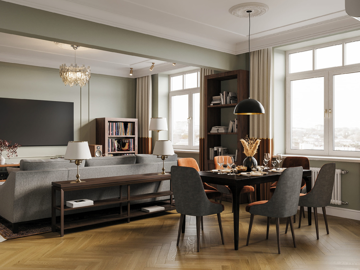 Это направление удачно сочетает элегантность классической архитектуры с удобством и лаконичностью современного дизайна. Оно подходит для тех, кто ценит благородство форм, но не хочет жить в музее.