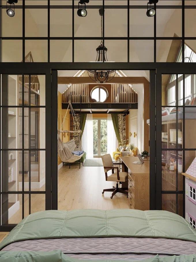 - Открытое пространство: Зонирование осуществляется с помощью мебели, света, ширм или стеклянных перегородок, а не капитальных стен.