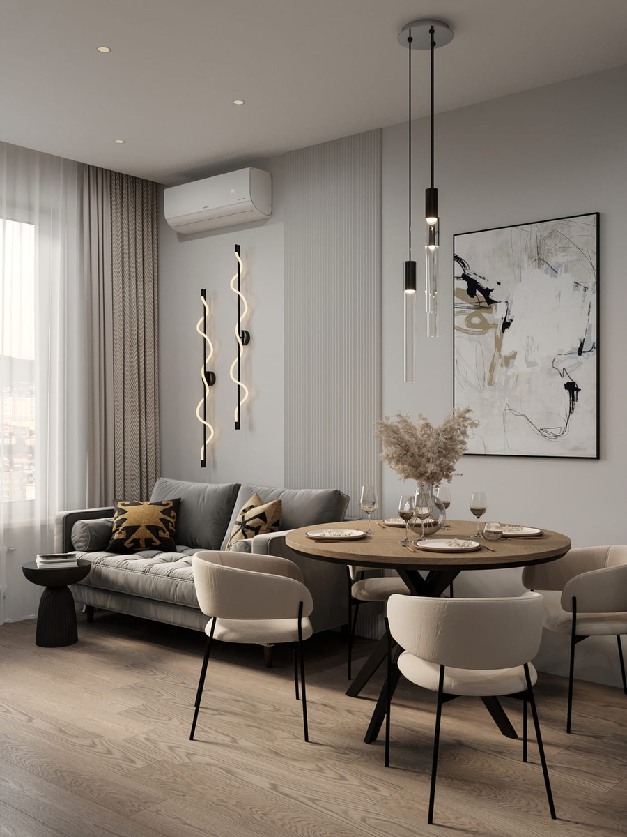Серый цвет, будучи повсеместно популярным, при неправильном применении создаёт холодную и безрадостную атмосферу, особенно в помещениях с северной ориентацией окон. Чтобы избежать этого, стоит выбирать сложные оттенки серого с тёплыми примесями — бежевым, розоватым или зелёным подтоном. Обязательным дополнением становятся акценты из натуральных материалов: деревянные элементы, тёмная фурнитура, живые растения, которые «согревают» пространство.