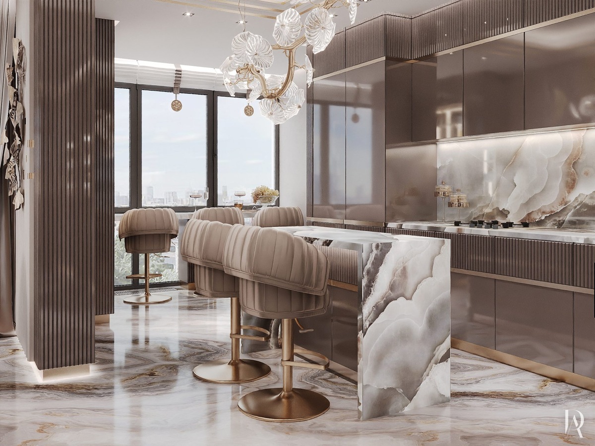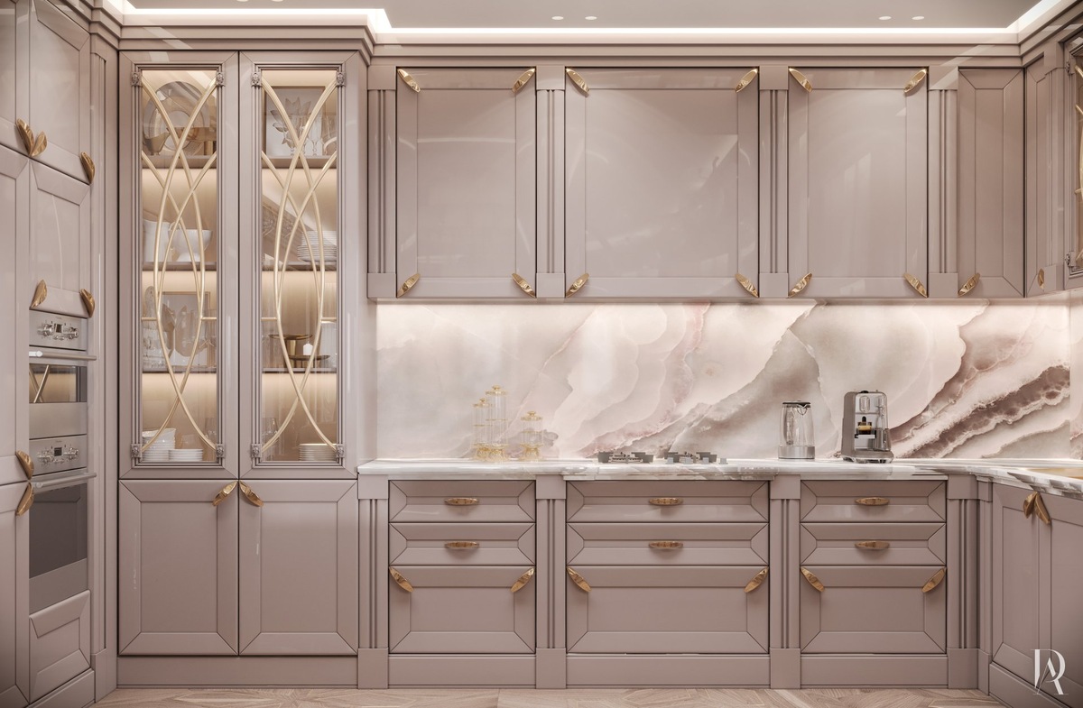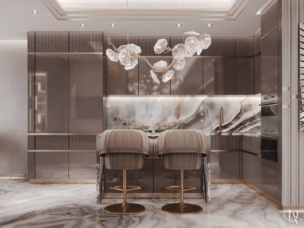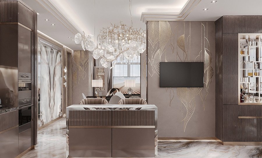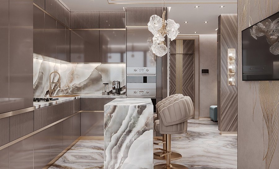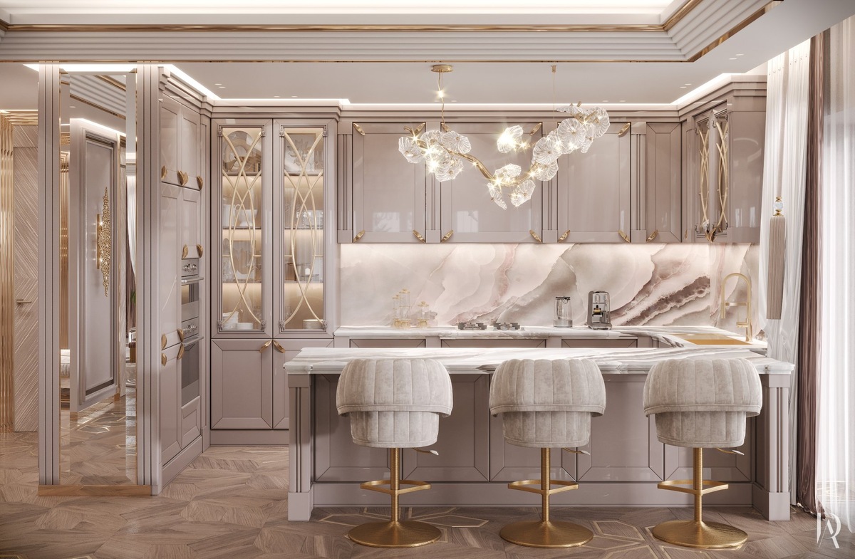 Как сделать кухню одновременно роскошной и элегантной? Нужно подобрать мебель и отделку в бежево-пудровой гамме, фурнитуру матового золота и оригинальный светильник в виде цветущей ветки для подсветки барной стойки.