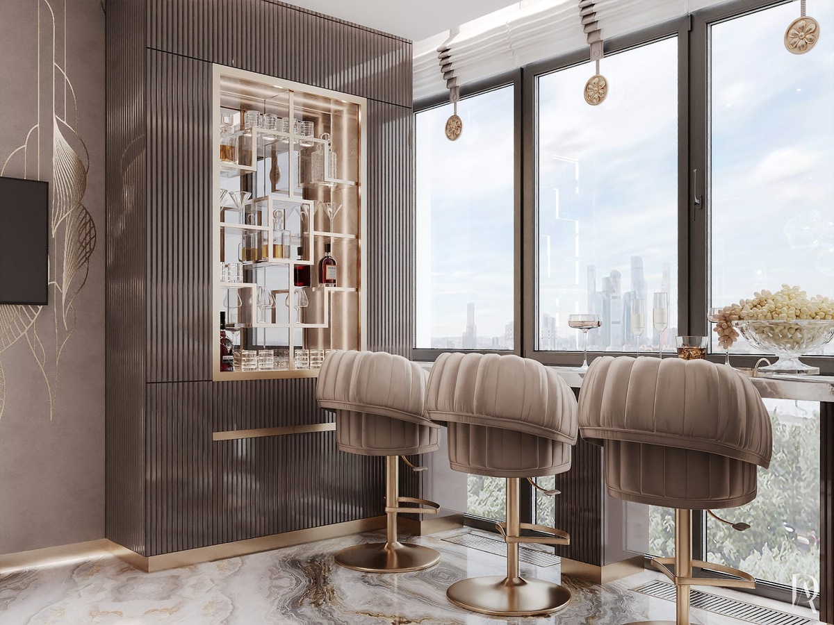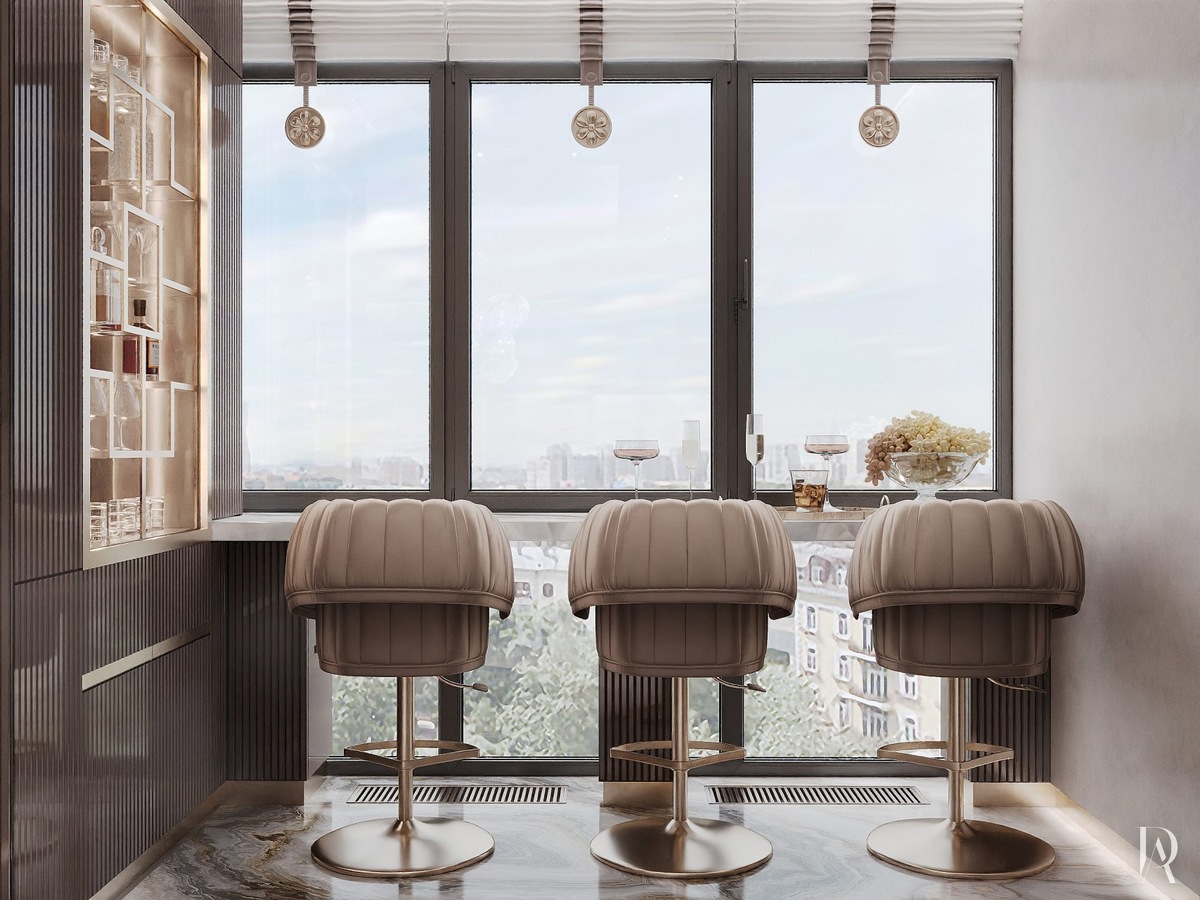 Пространство присоединённой лоджии трансформировали в домашний бар, он же — смотровая площадка, которая органично продолжает кухню. Здесь можно провести великолепный вечер с панорамным видом на город или наполниться энергией утреннего света.
