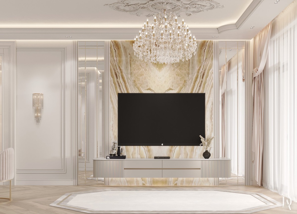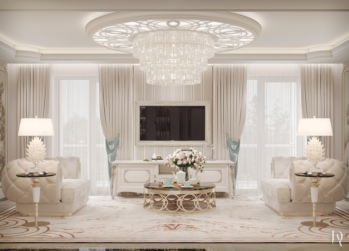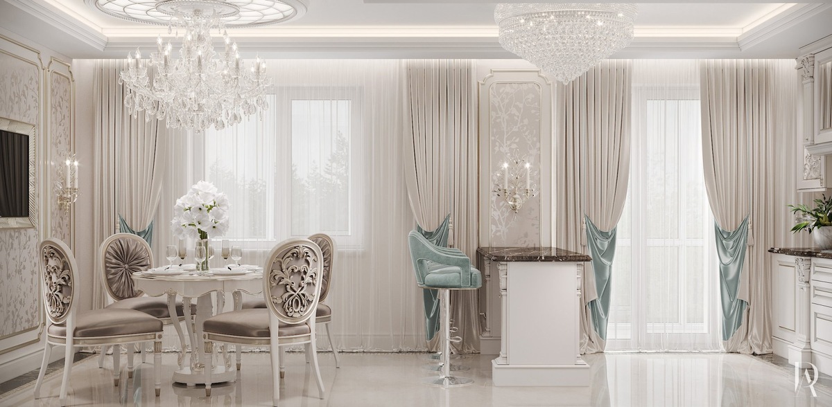 Молочно-белые тона акцентированы пастельным бирюзовым, образуя освежающий дуэт. Это подчёркивается обилием света от люстр, скрытых карнизных диодных лент и витражей.