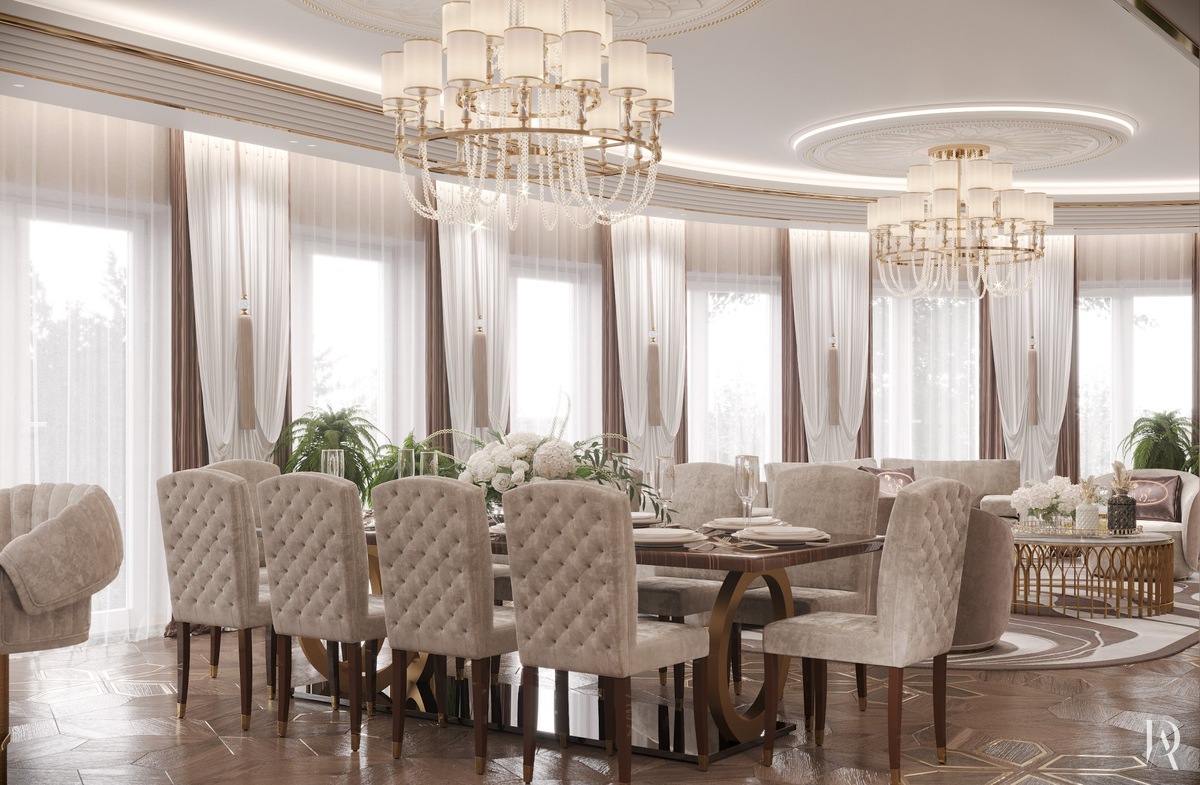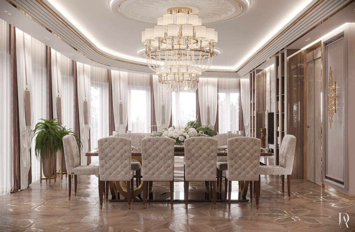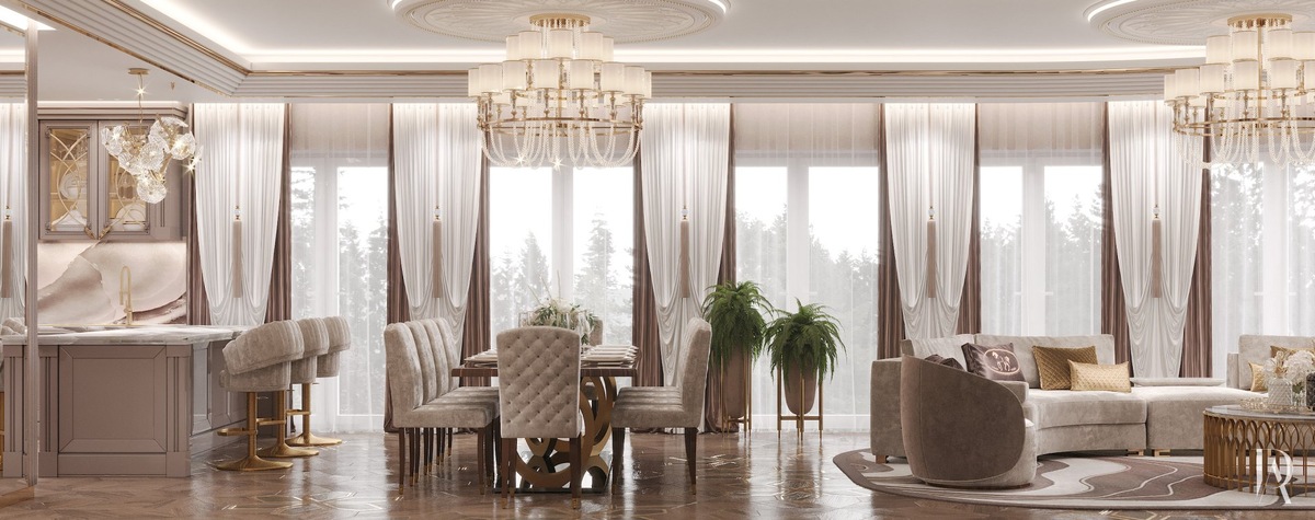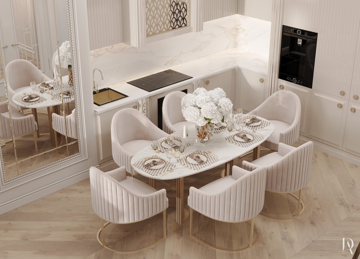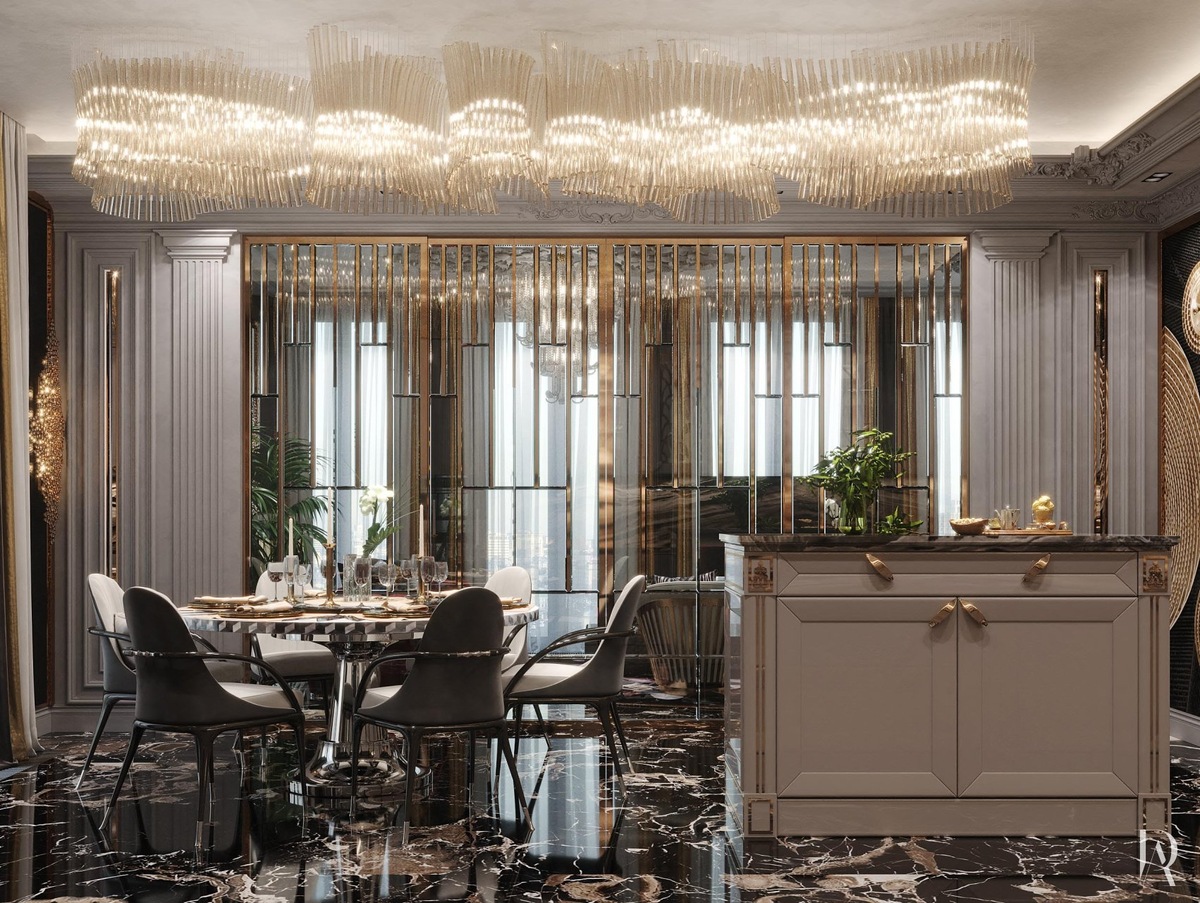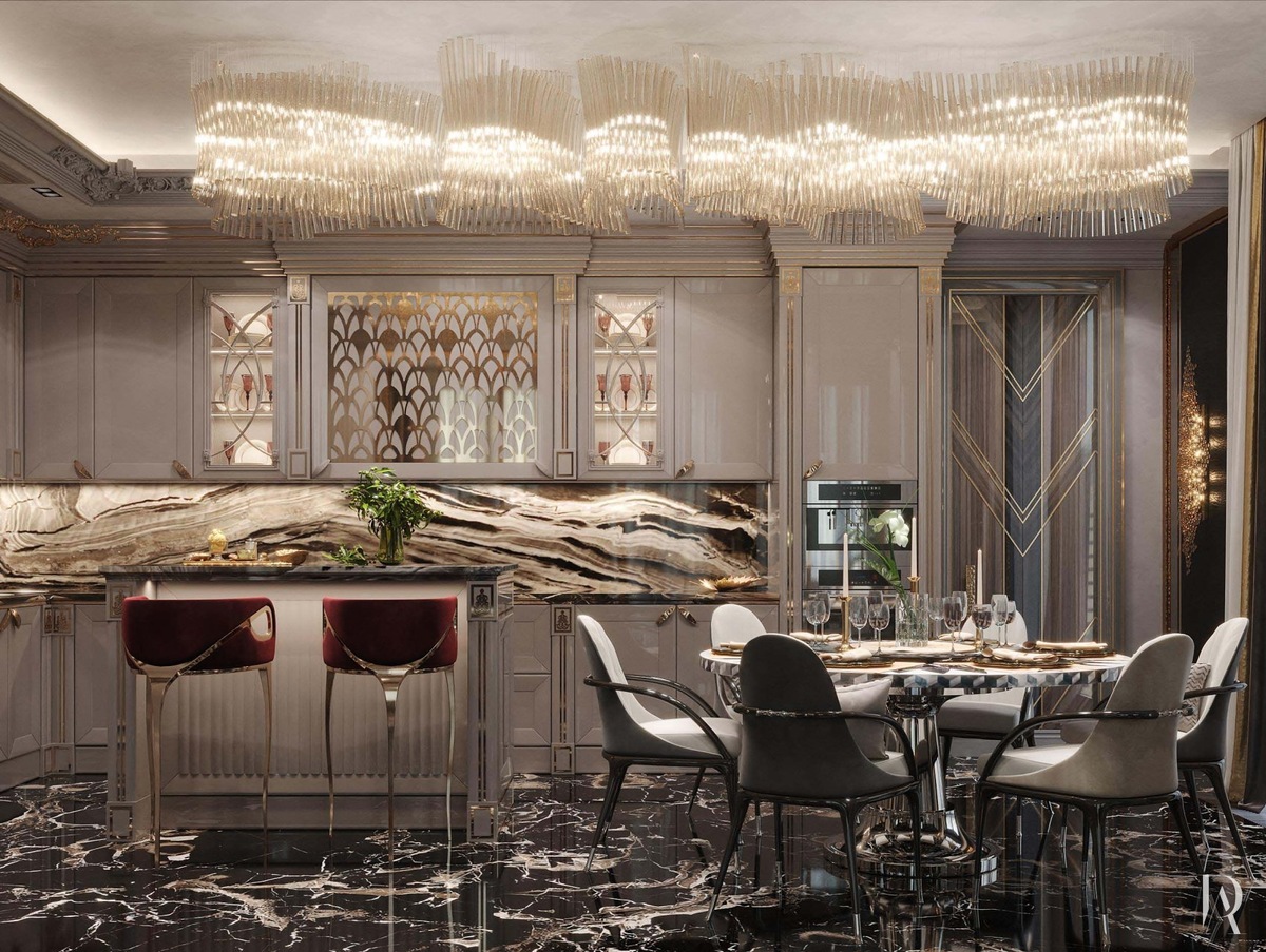 Золотистые аксессуары и декор, которых в кухне-столовой очень много, усиливают эффект сияния, делая интерьер по-настоящему роскошным.