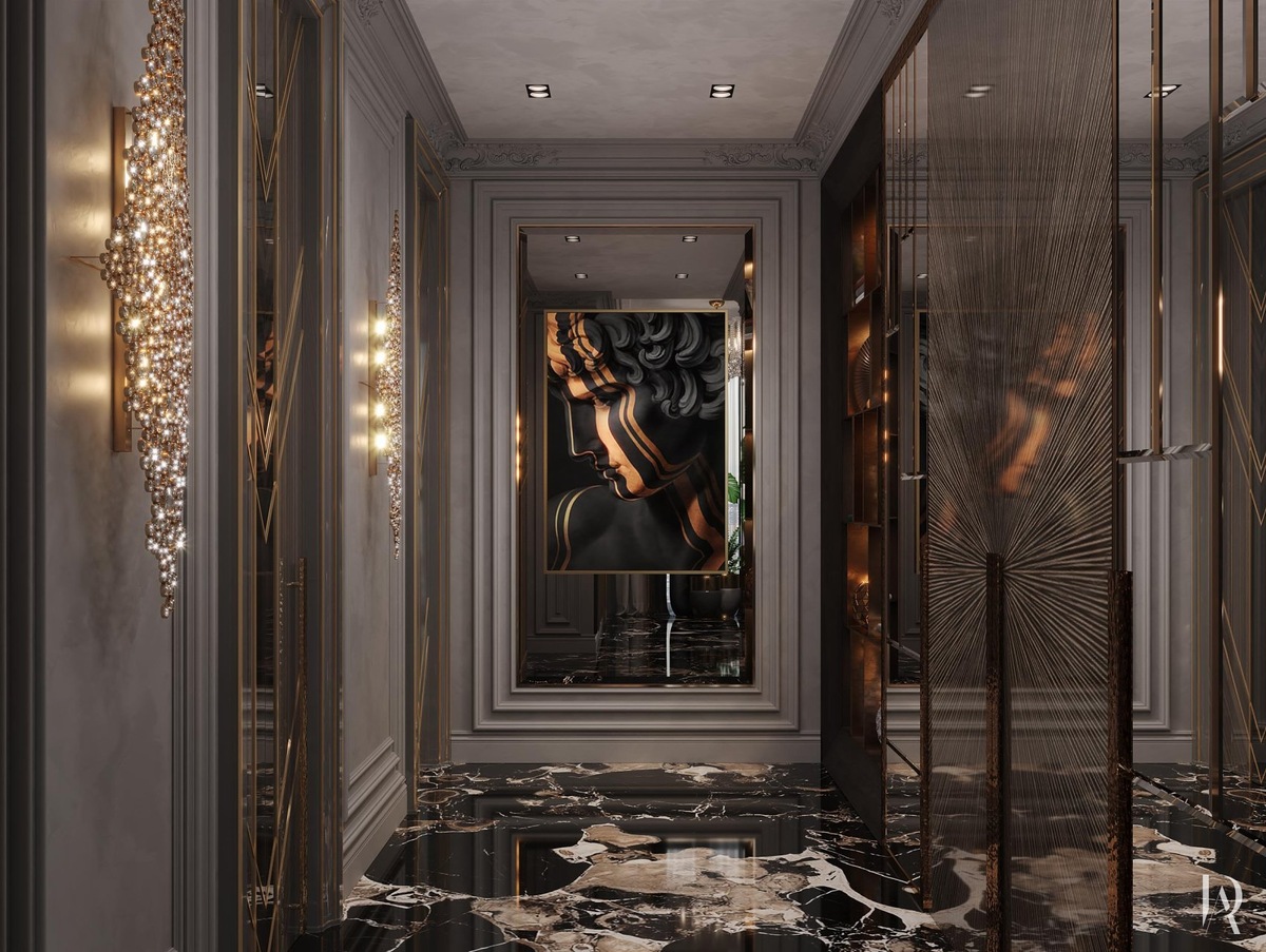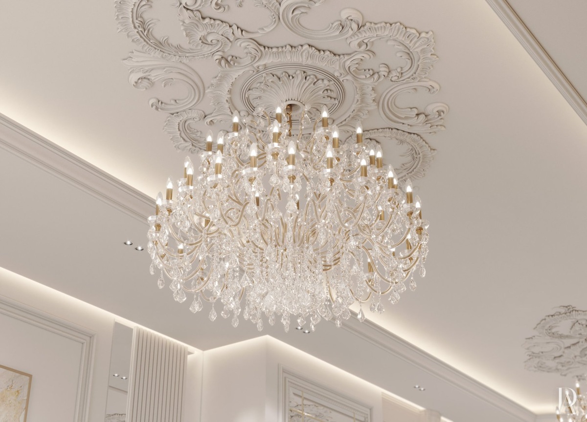 Пышная барочная лепнина становится удачным дополнением к арт-деко. В проекте выбраны витиеватые розетки в форме ромба: на потолке под люстрами они гипсовые и серые, а на стенах — лёгкие, ажурные, используемые как рассеиватели для бра.