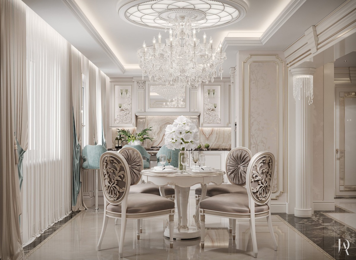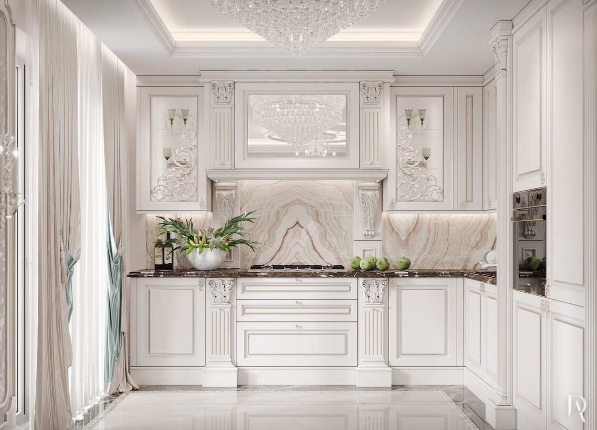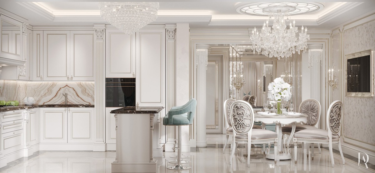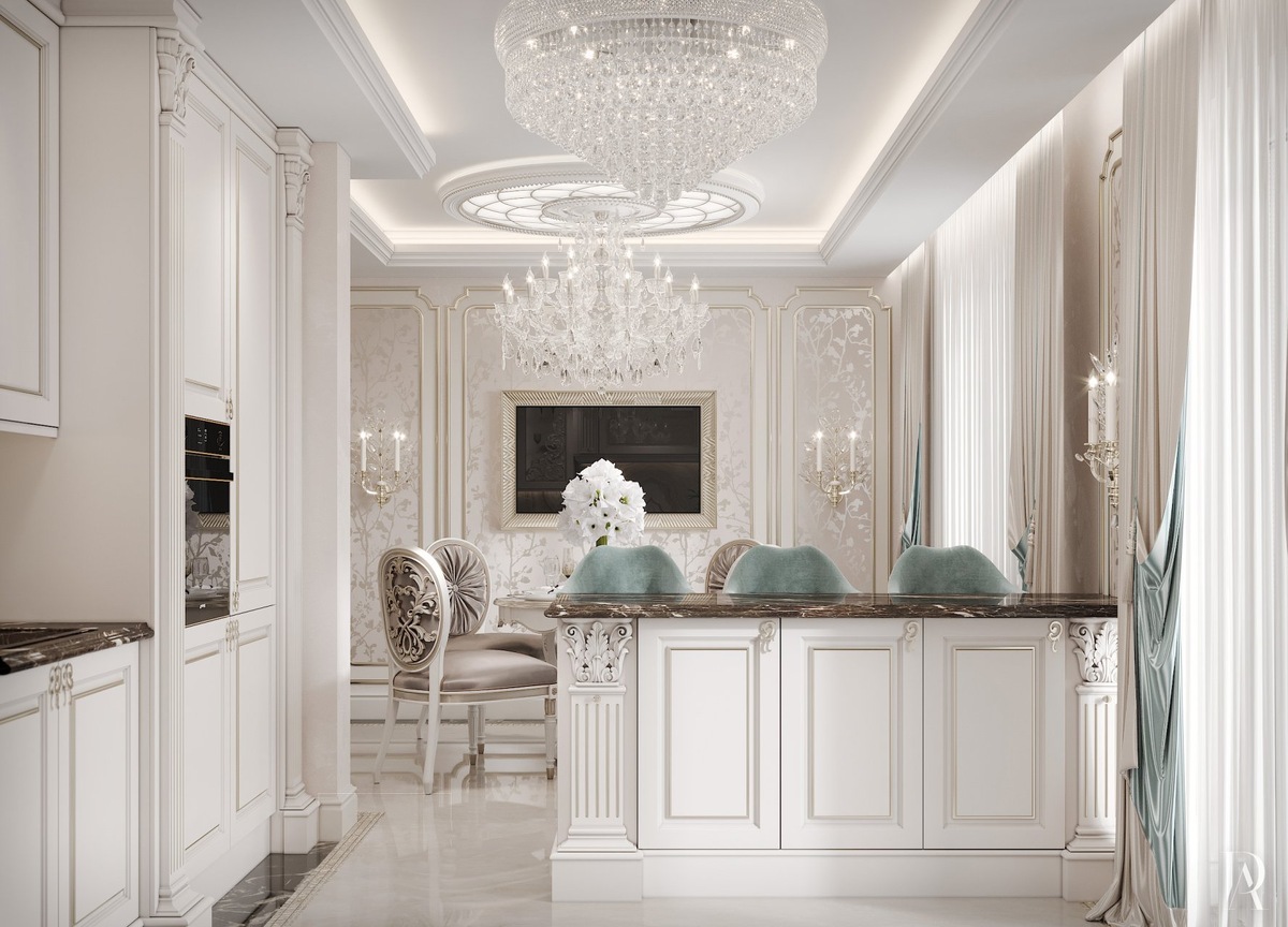Белая кухня с классическим профилем и полированным мраморным полом смотрится лёгкой и изысканной. Остров-барная стойка отделяет зону приготовления пищи от мини-столовой, а хрустальные люстры наполняют обстановку торжественностью.