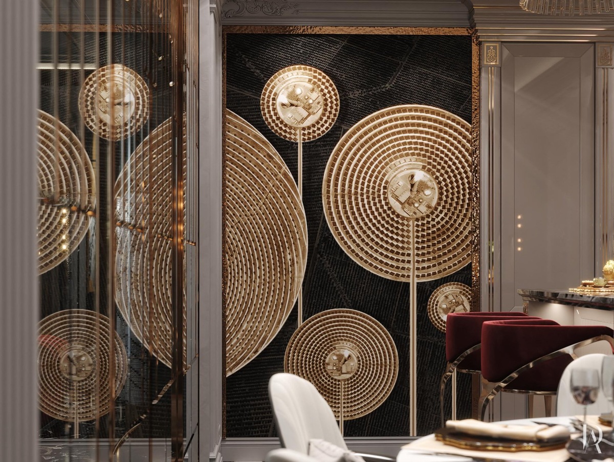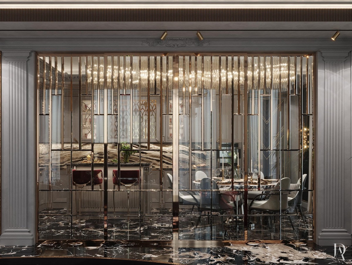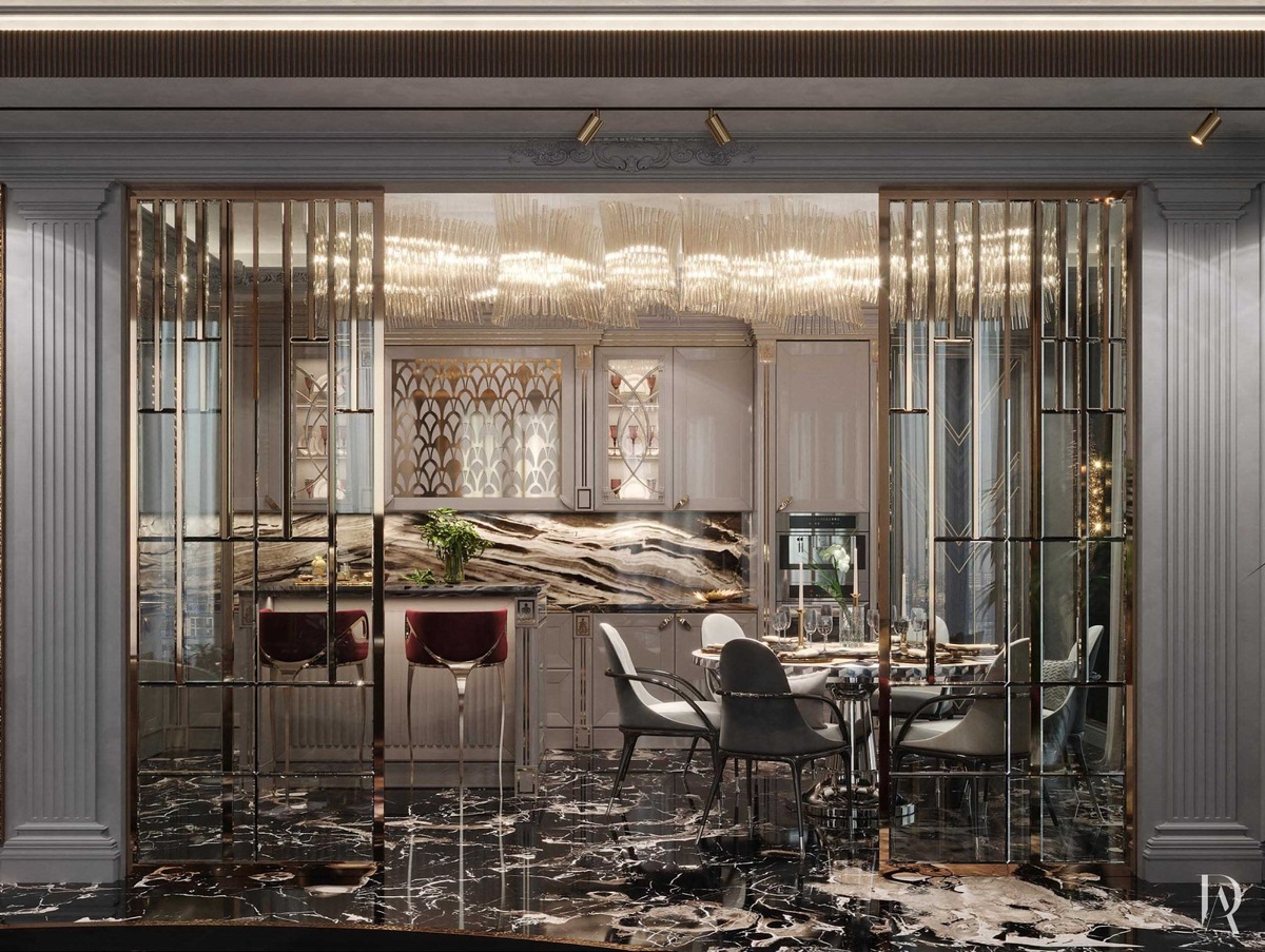Стеклянная раздвижная перегородка с золотистой раскладкой отделяет кухню от гостиной. Она служит и разделителем пространства, и уникальным декоративным артефактом.