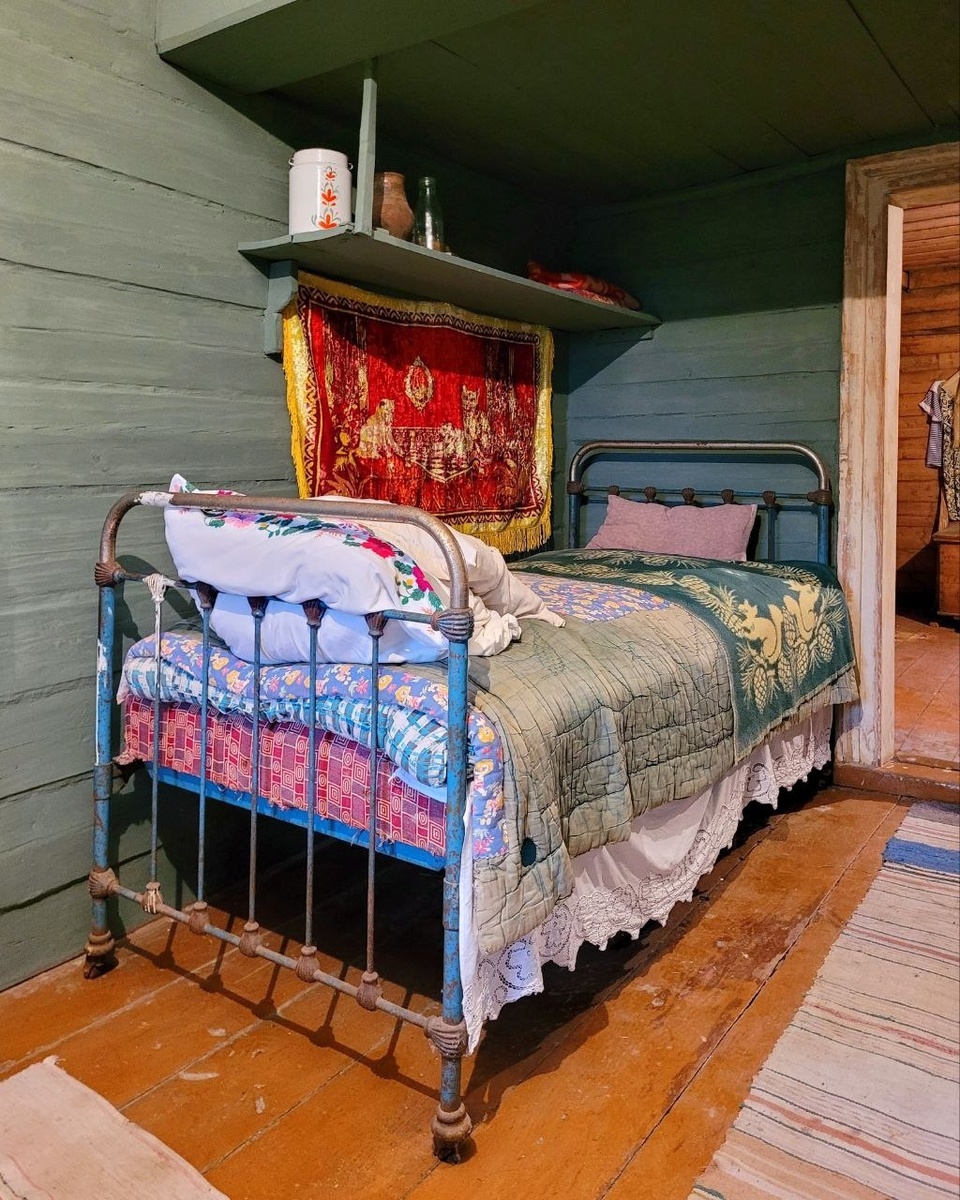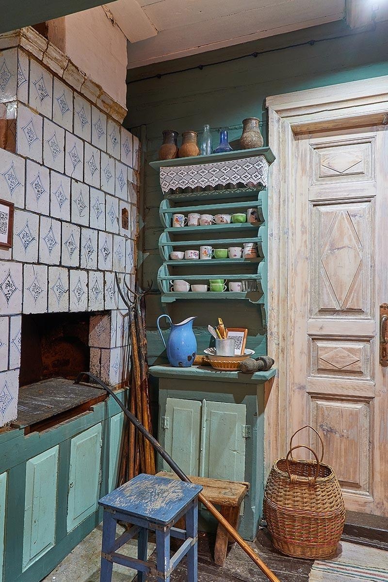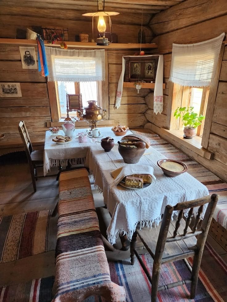 - Материалы: Необработанное или грубо обработанное дерево (сосна, ель), глина, льняные и шерстяные ткани, мочало, лоза. Камень используется реже, обычно для фундамента или печи.