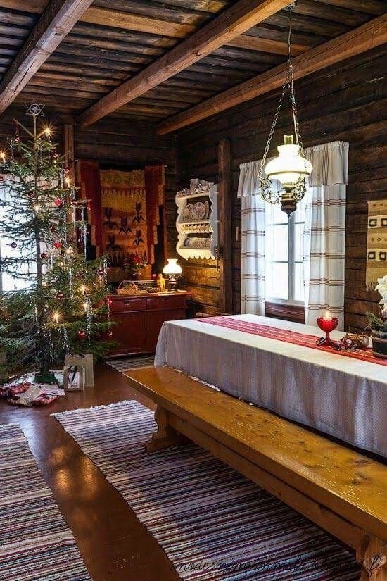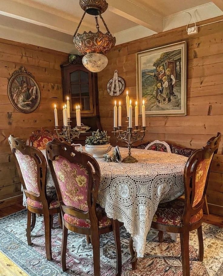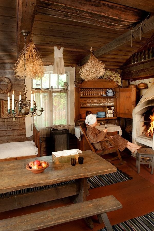 - Освещение: Простое освещение: свечи, масляные лампы, деревянные люстры в виде колеса с рожками. Свет должен быть теплым и неярким, подчеркивающим фактуру дерева.