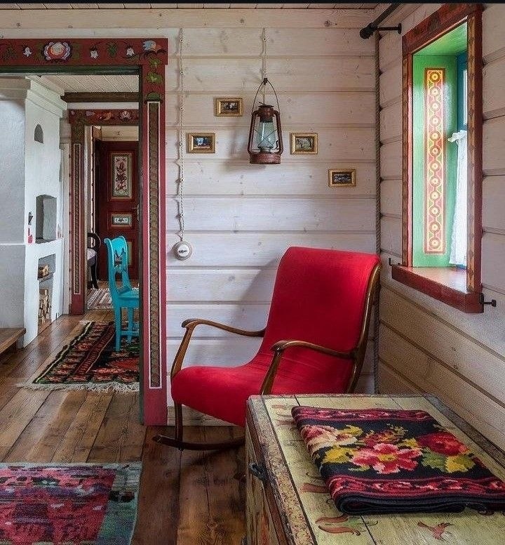 - Мебель: Простая, функциональная мебель из дерева: лавки без спинок, массивные столы с прямыми ножками, сундуки для хранения вещей, открытые полочки. Мебель может быть украшена резьбой, росписью (например, хохлома или городецкая роспись), но без излишней вычурности.