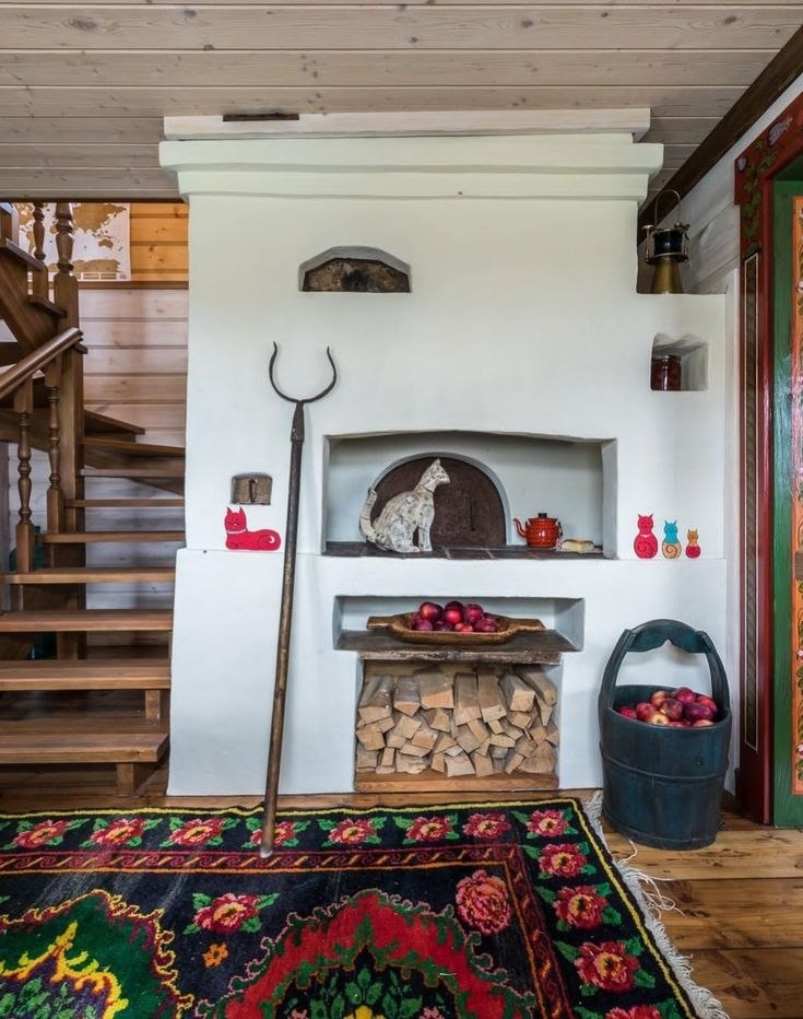 - Декор: Вышитые полотенца с символическими узорами, рушники, расписные подносы (например, жостовские), глиняная посуда (крынки, плошки), самотканые ковры-дорожки, лубочные картинки с народными сюжетами. Иконы занимают важное место в интерьере, их размещали в красном углу.