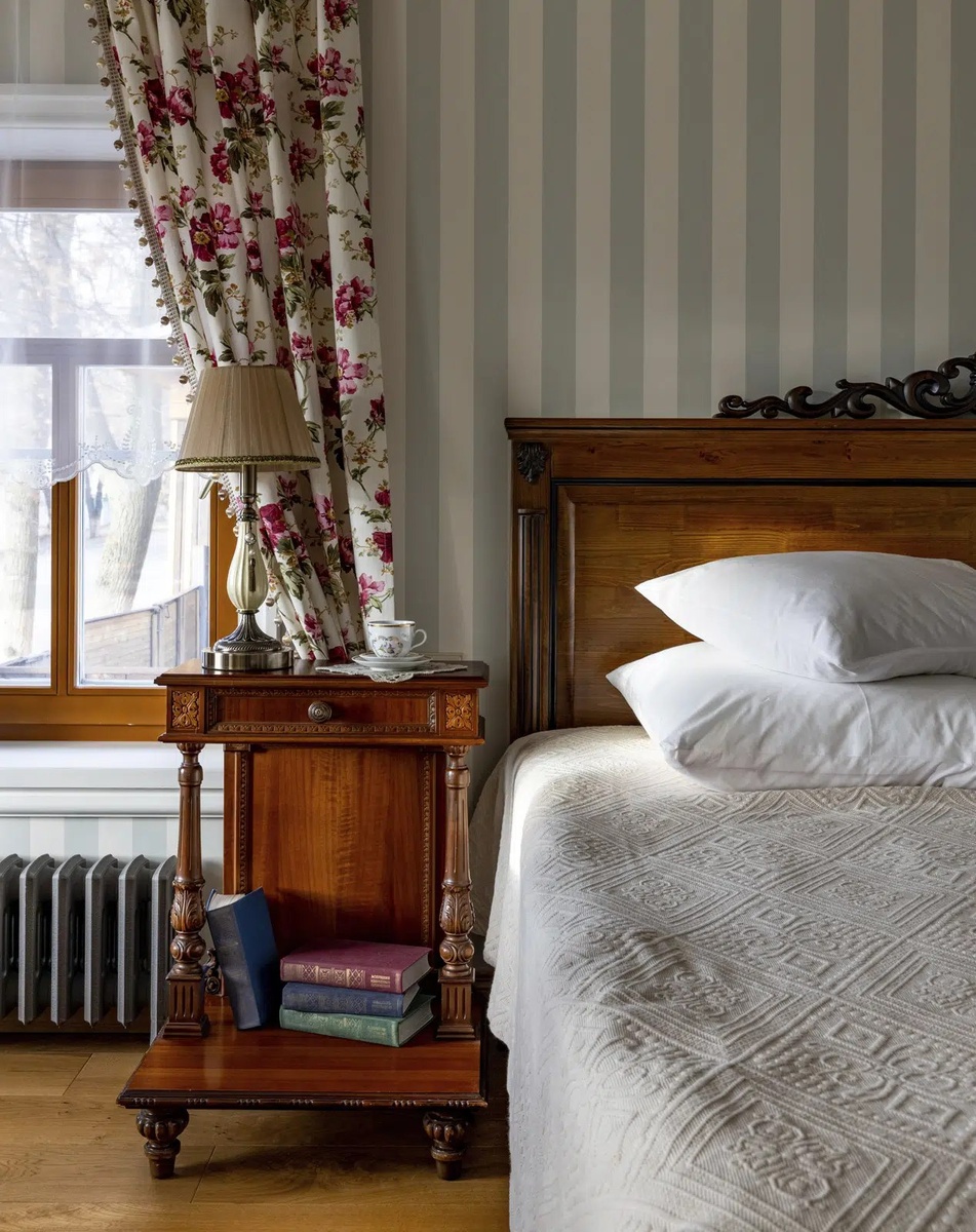 - Материалы: Натуральное дерево ценных пород (дуб, орех), камень, текстиль (лен, ситец, шелк), ковка. Мебель часто инкрустирована перламутром или костью, резьба по дереву – важный элемент декора, придающий интерьеру глубину.