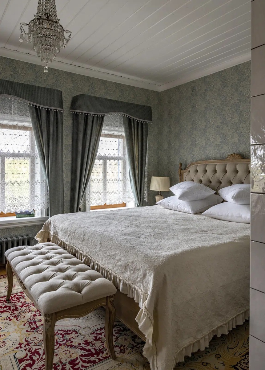 - Освещение: Кристальные люстры с подвесками, бра с тканевыми абажурами, настольные лампы с росписью. Свет должен быть мягким и рассеянным, создающим камерную атмосферу.