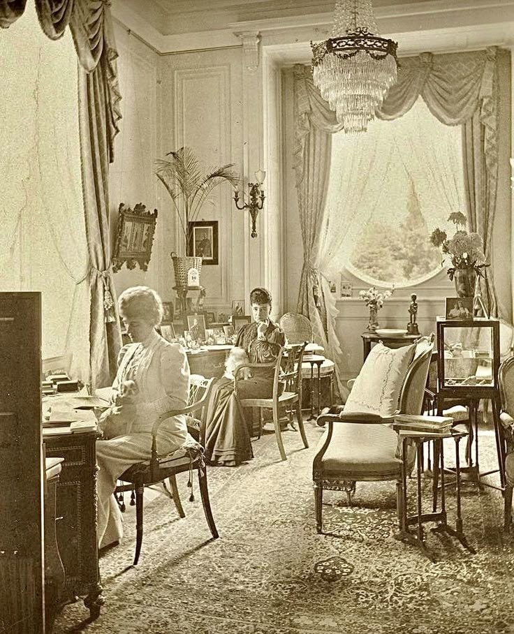 - Декор: Портреты в позолоченных рамах, фарфоровые сервизы, хрустальные бокалы, гобелены с мифологическими сюжетами, ковры с растительными орнаментами, камины с мраморными порталами, зеркала в витых рамах. Особое место занимают малахитовые шкатулки и бронзовые канделябры.