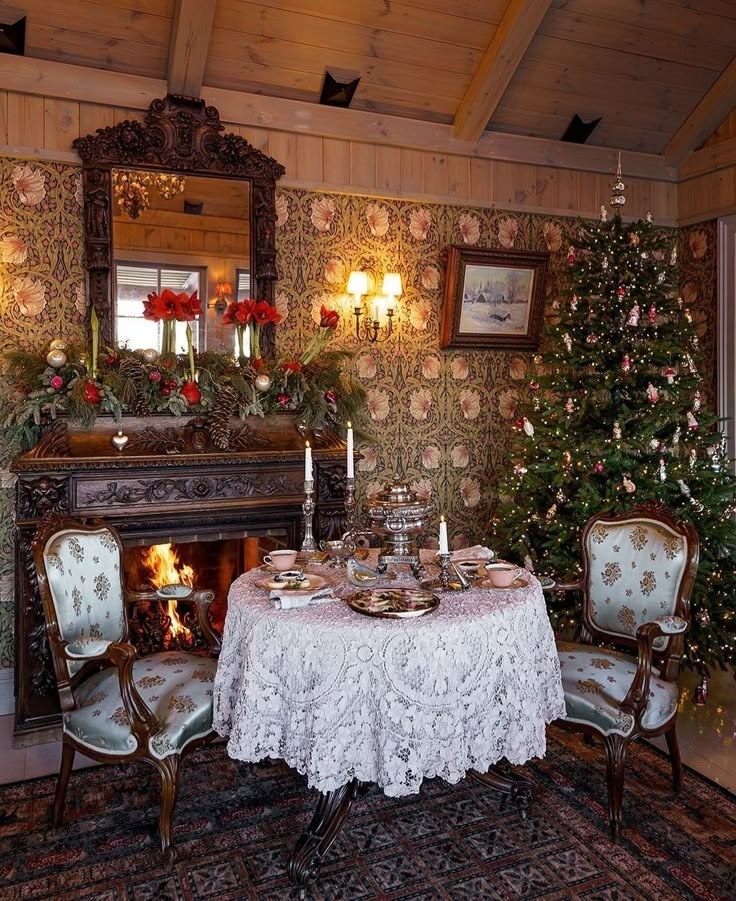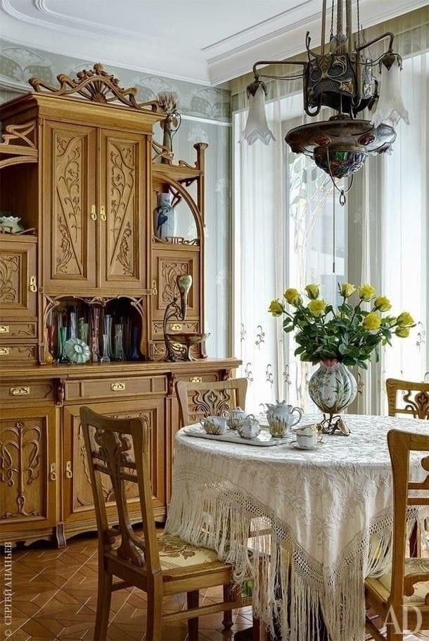 - Мебель: Массивные, но элегантные предметы: резные кресла с мягкой обивкой, столы из темного дерева с массивными ножками, комоды с инкрустацией. Часто используются антикварные или стилизованные под старину предметы, такие как бюро или секретеры.